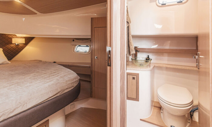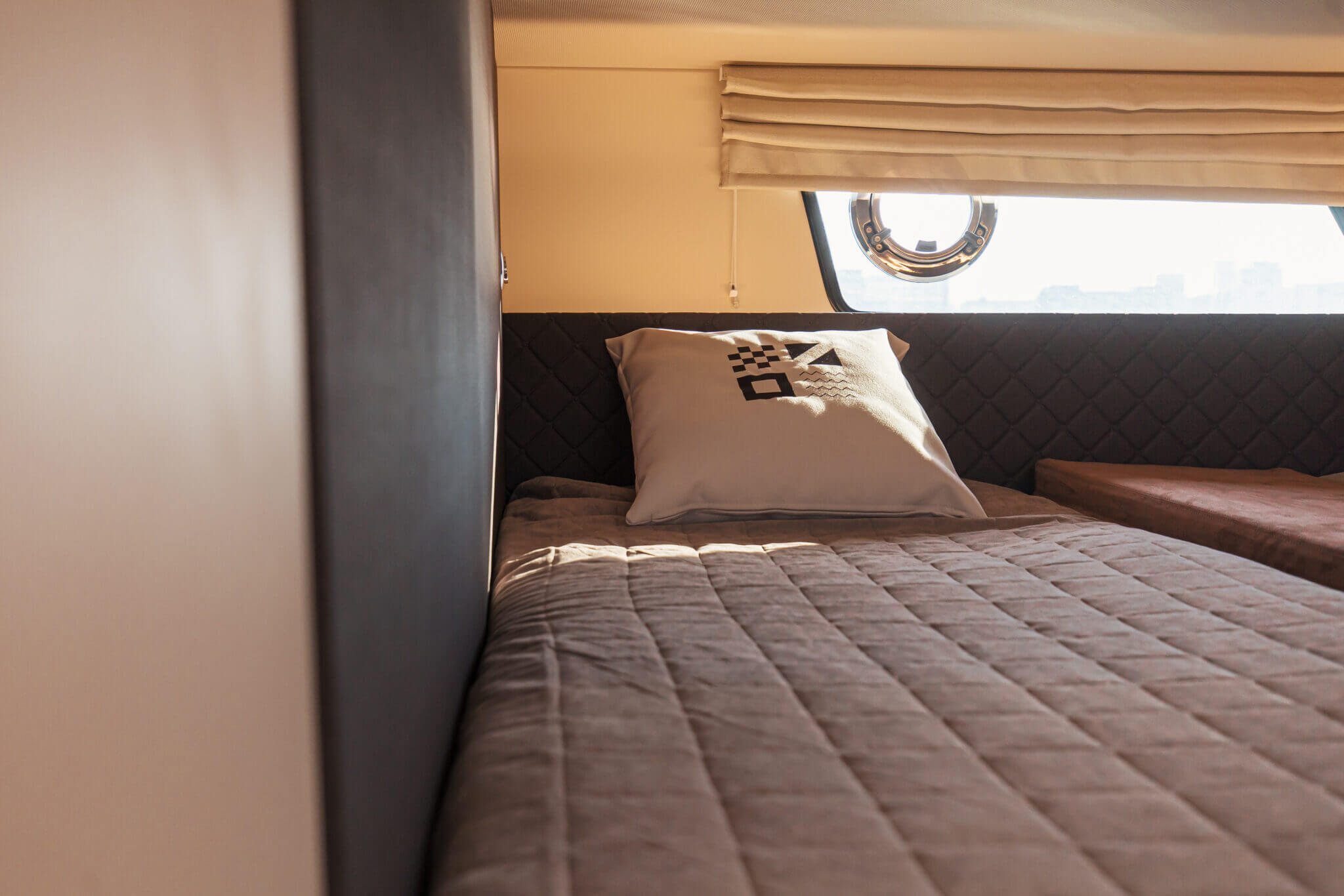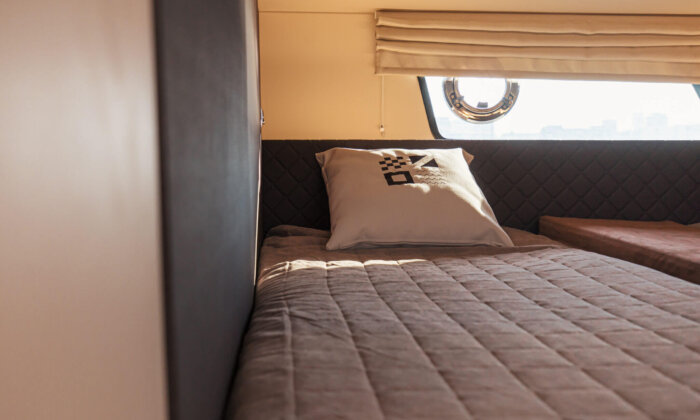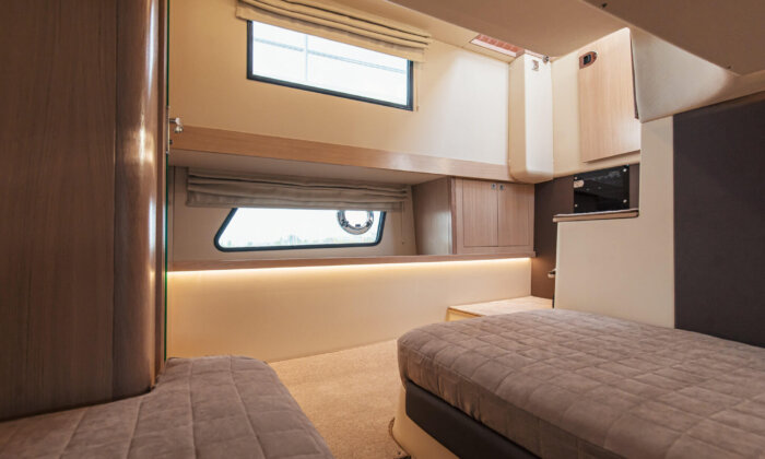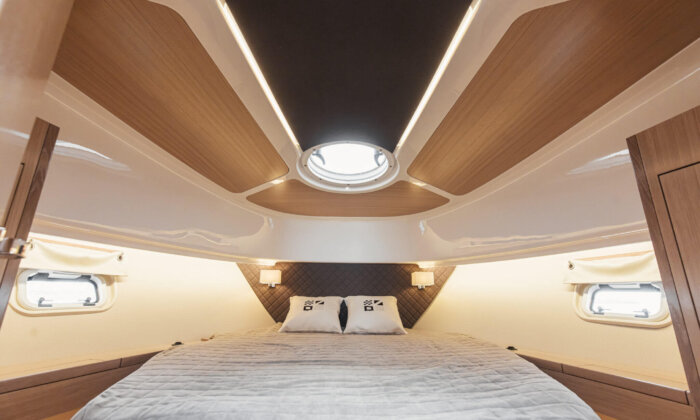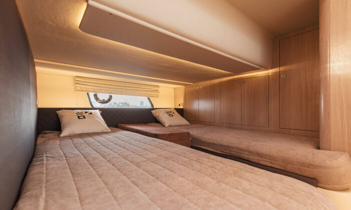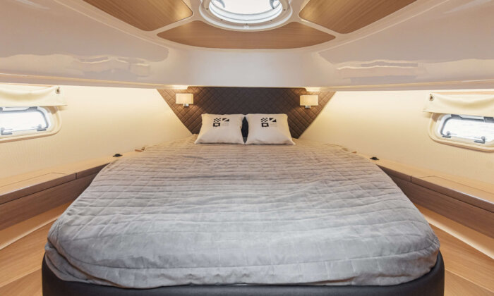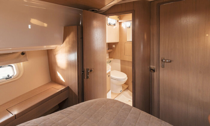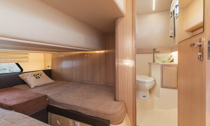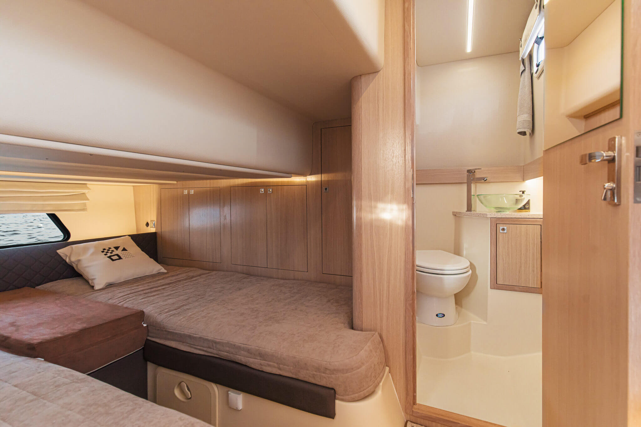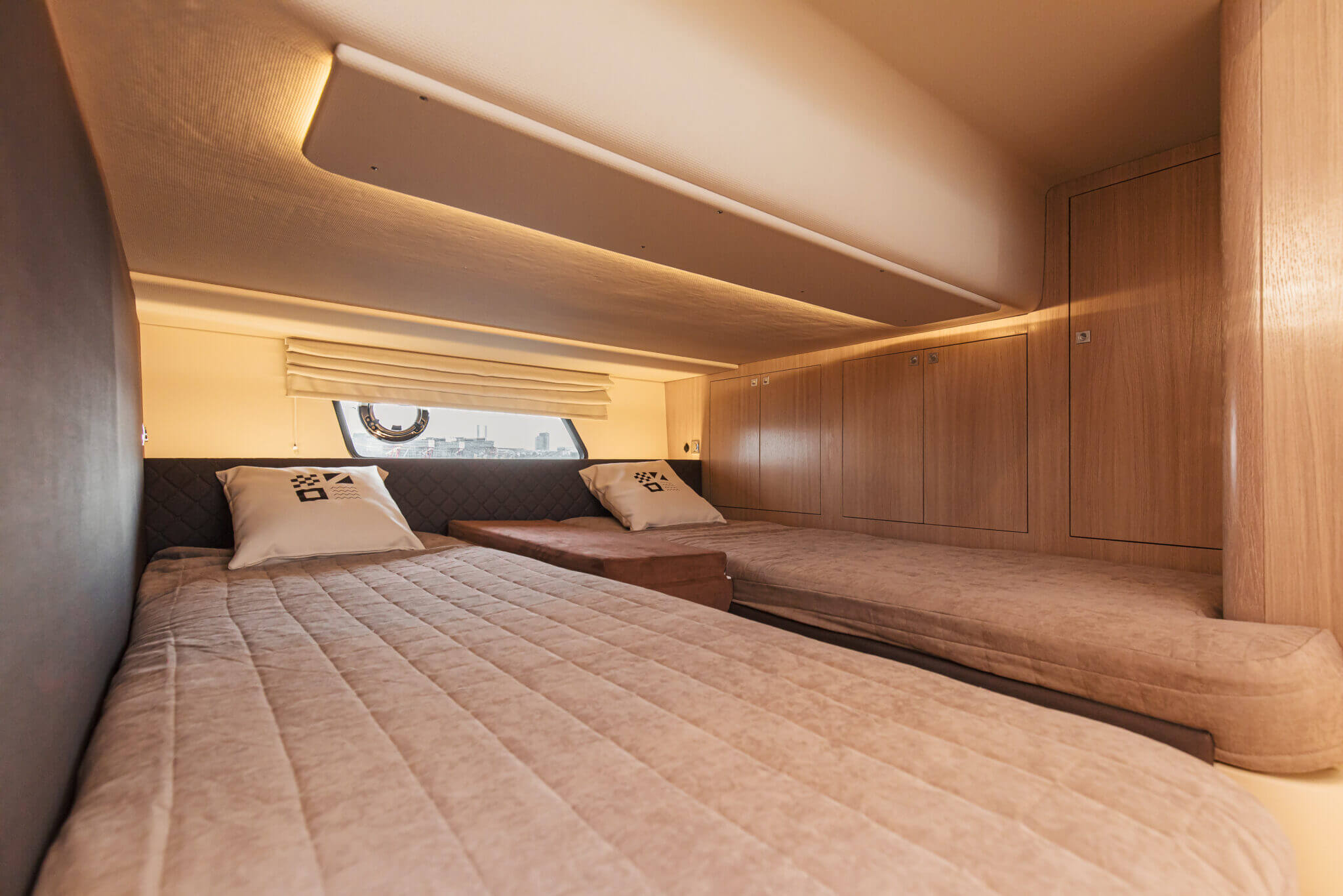 Kaks täisväärtuslikku kajutit, mõlemad oma privaatse tualeti ja dušiga, tagavad privaatsuse ja mugavuse kuni viiele inimesele. Esimeses kajutis asub lai kahekohaline voodi, teises täislaiuses kajutis mugav magamislahendus kahele või kolmele.