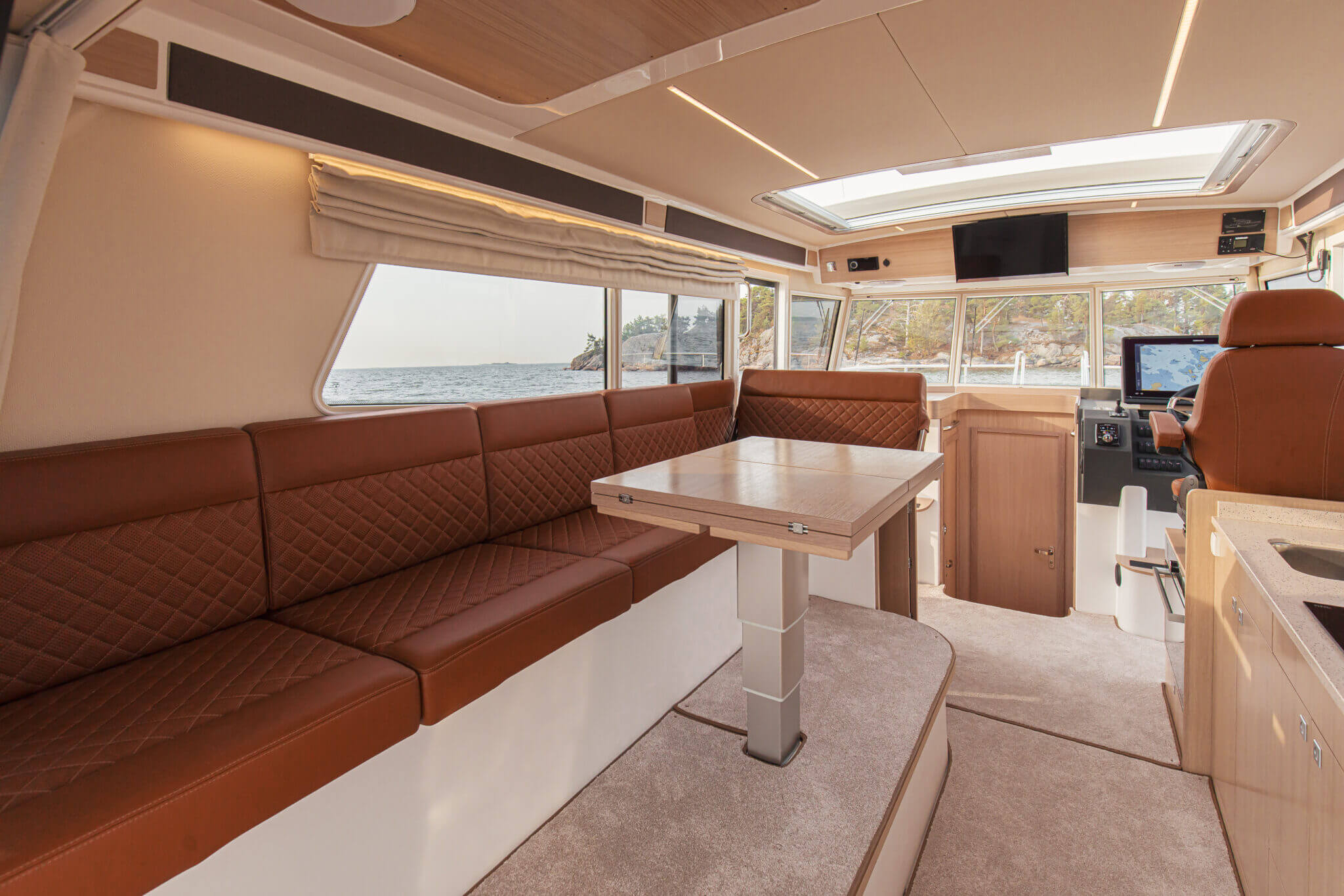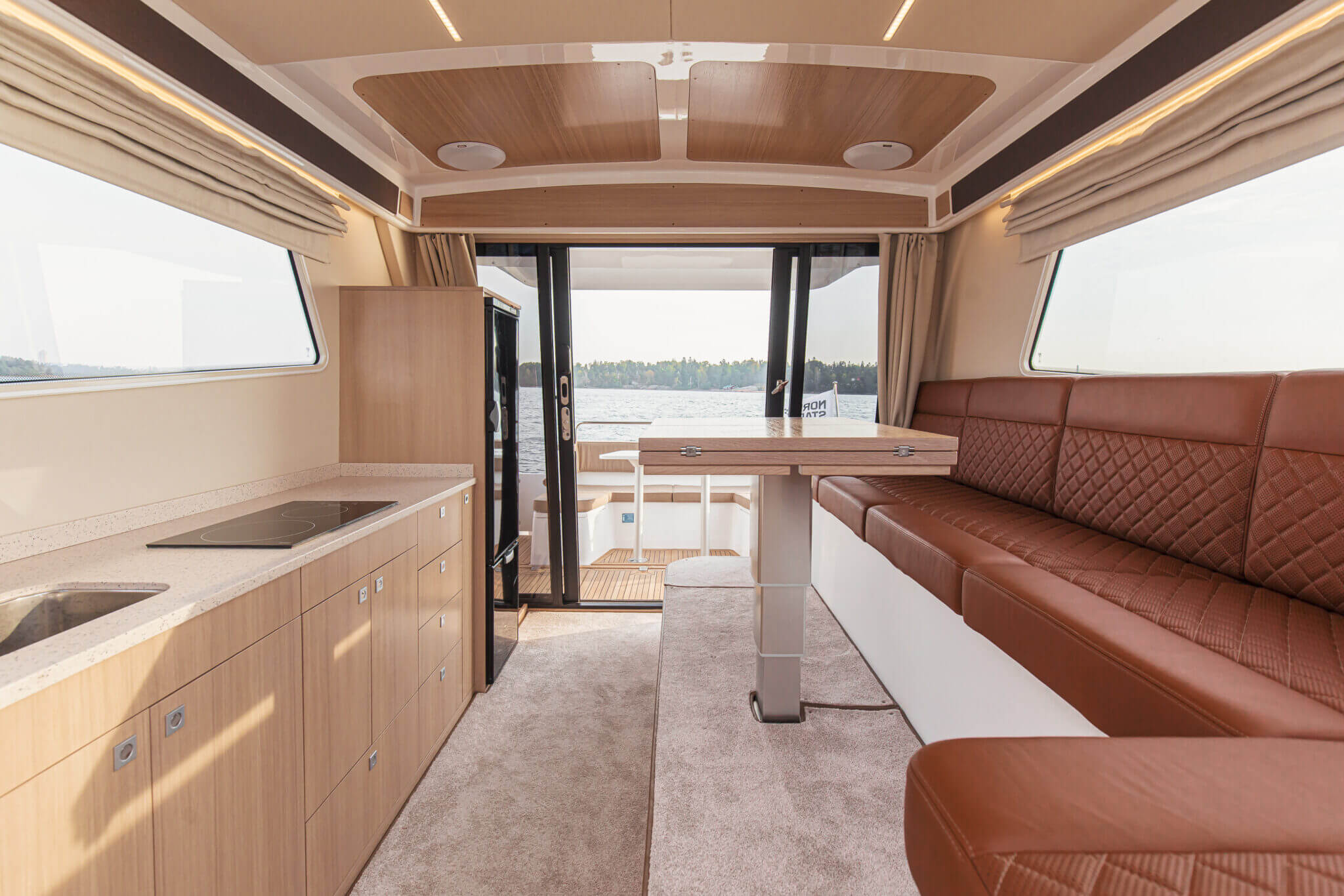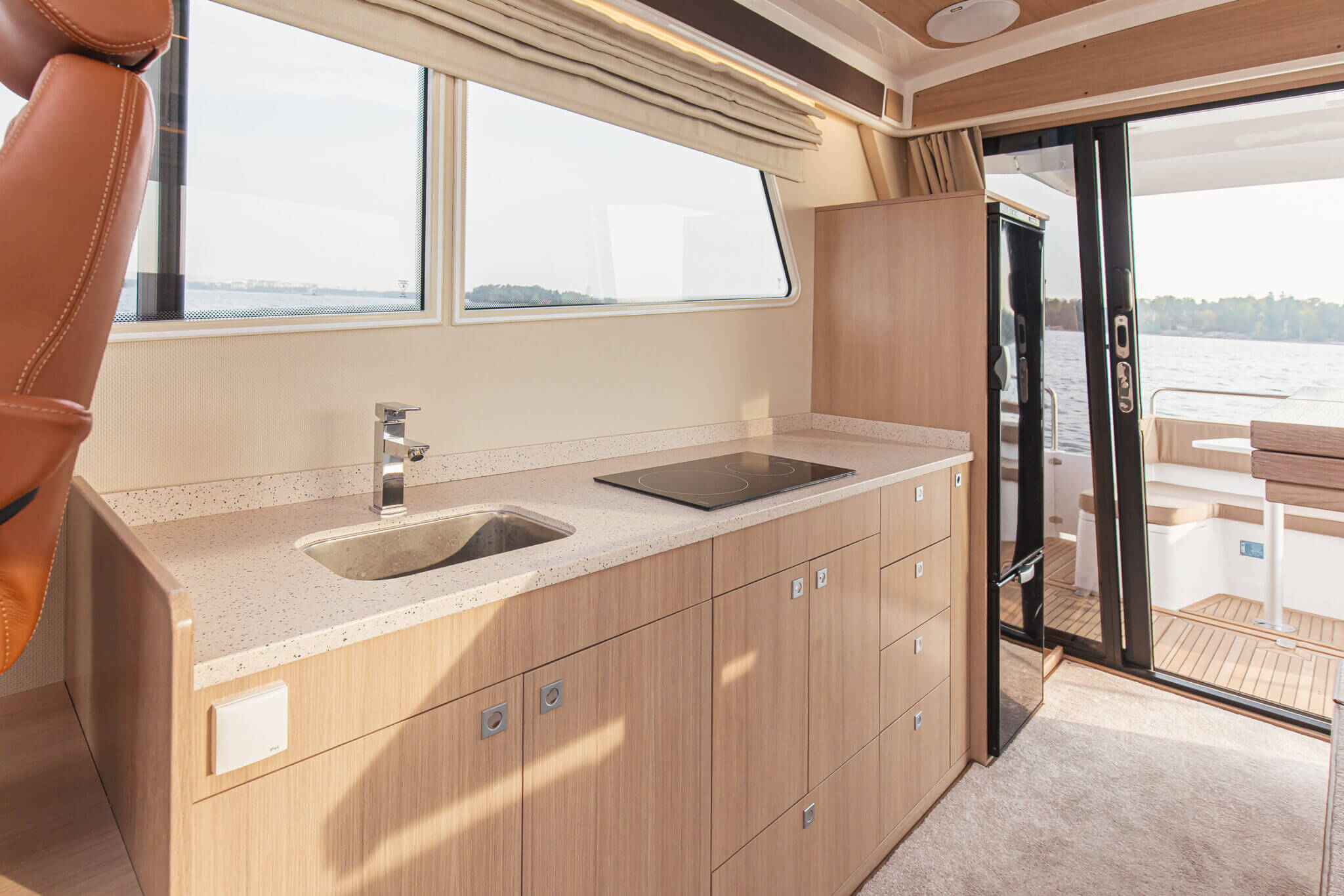 Avar köögiala alumisel tekil, sujuvalt ühenduv luksusliku salongiga, pakub ruumi nii igapäevasteks tegevusteks kui ka meelelahutuseks. Suur ahtritekk ja elegantselt kujundatud sotsiaalala sobivad suurepäraselt nii päevaseks lõõgastumiseks kui õhtusteks hetkeks merel. Soovi korral on saadaval ka flybridge – lisades mudelile sportlikkust, parem nähtavus ja veelgi rohkem ruumi ühiseks ajaveetmiseks.