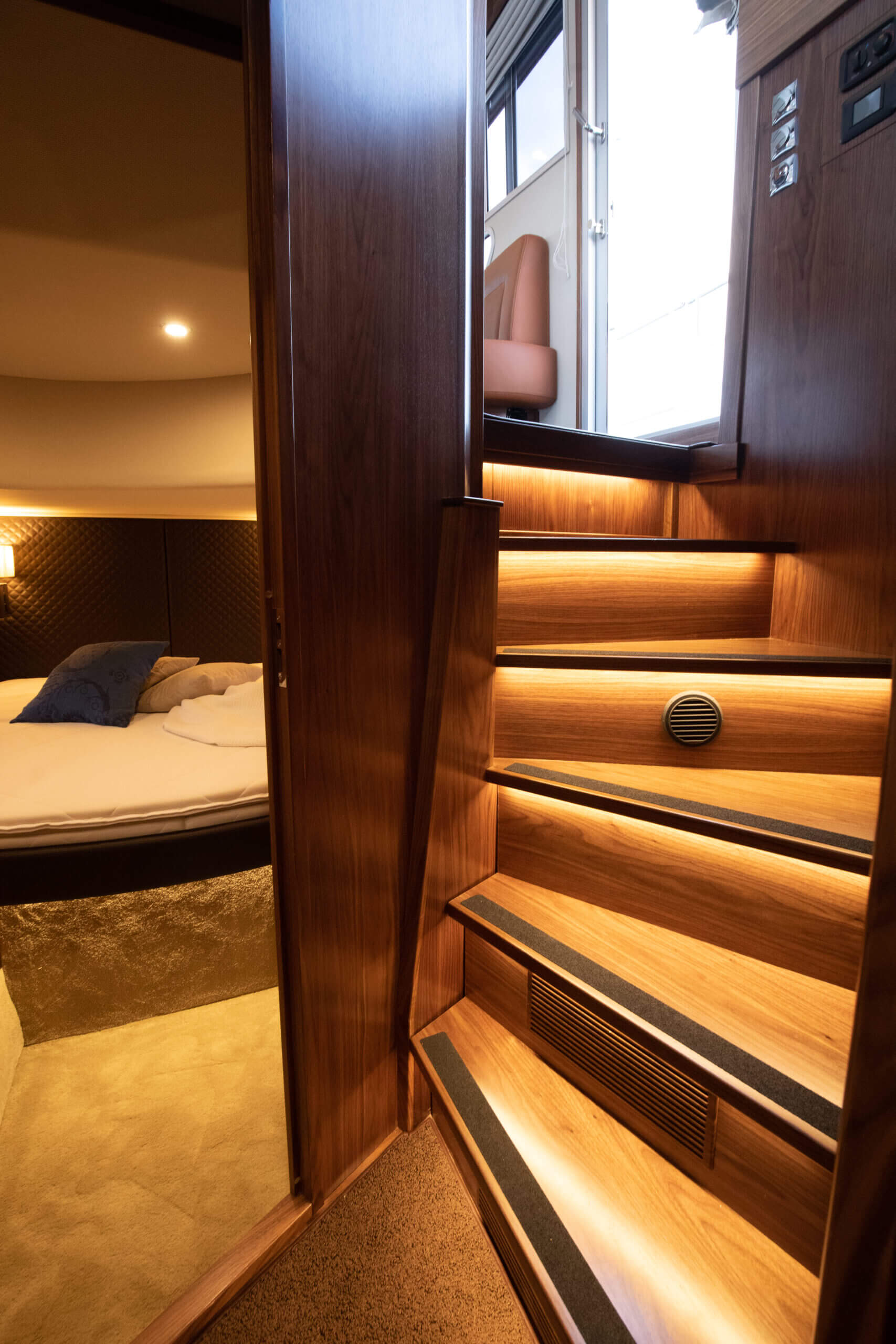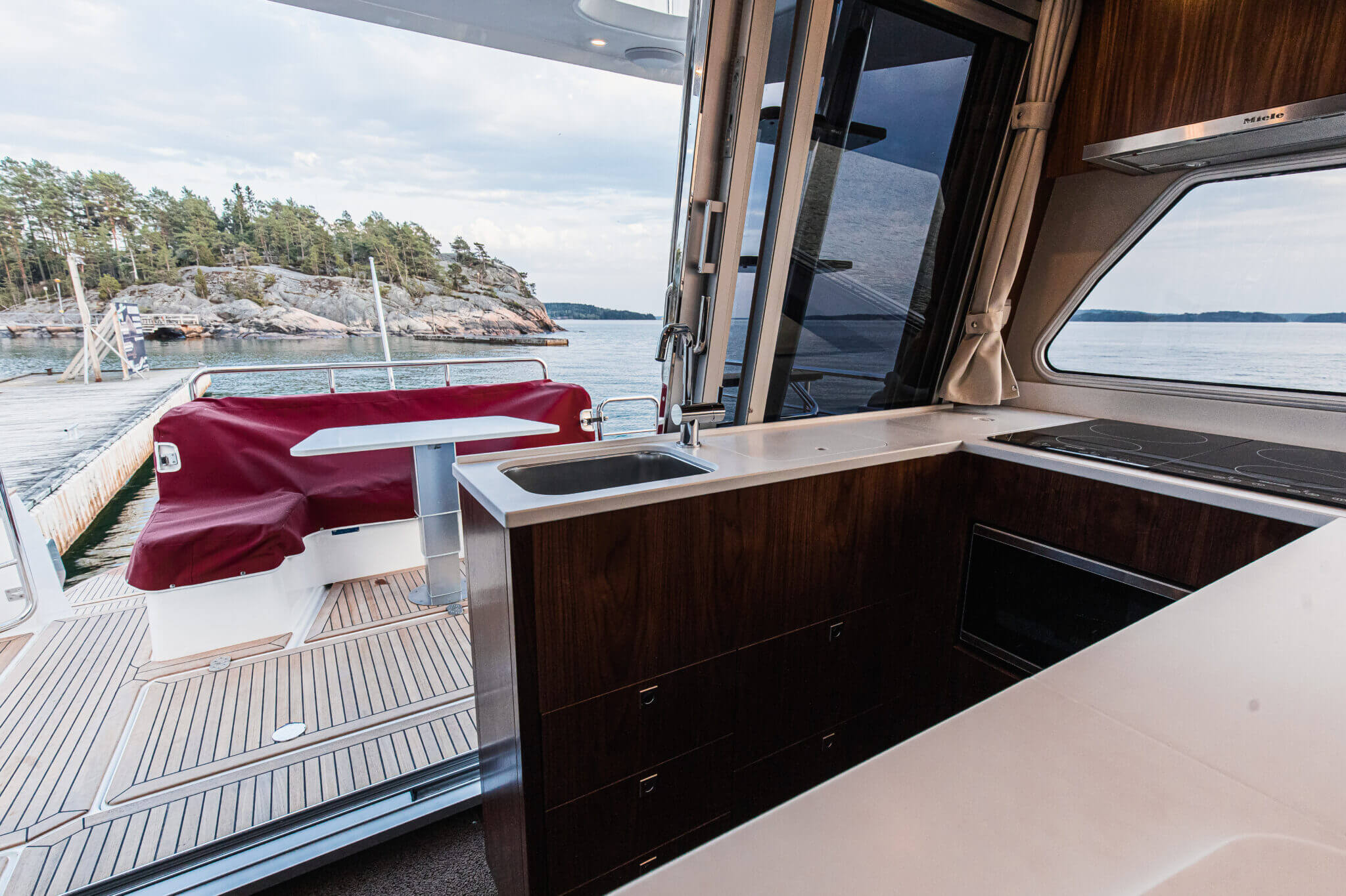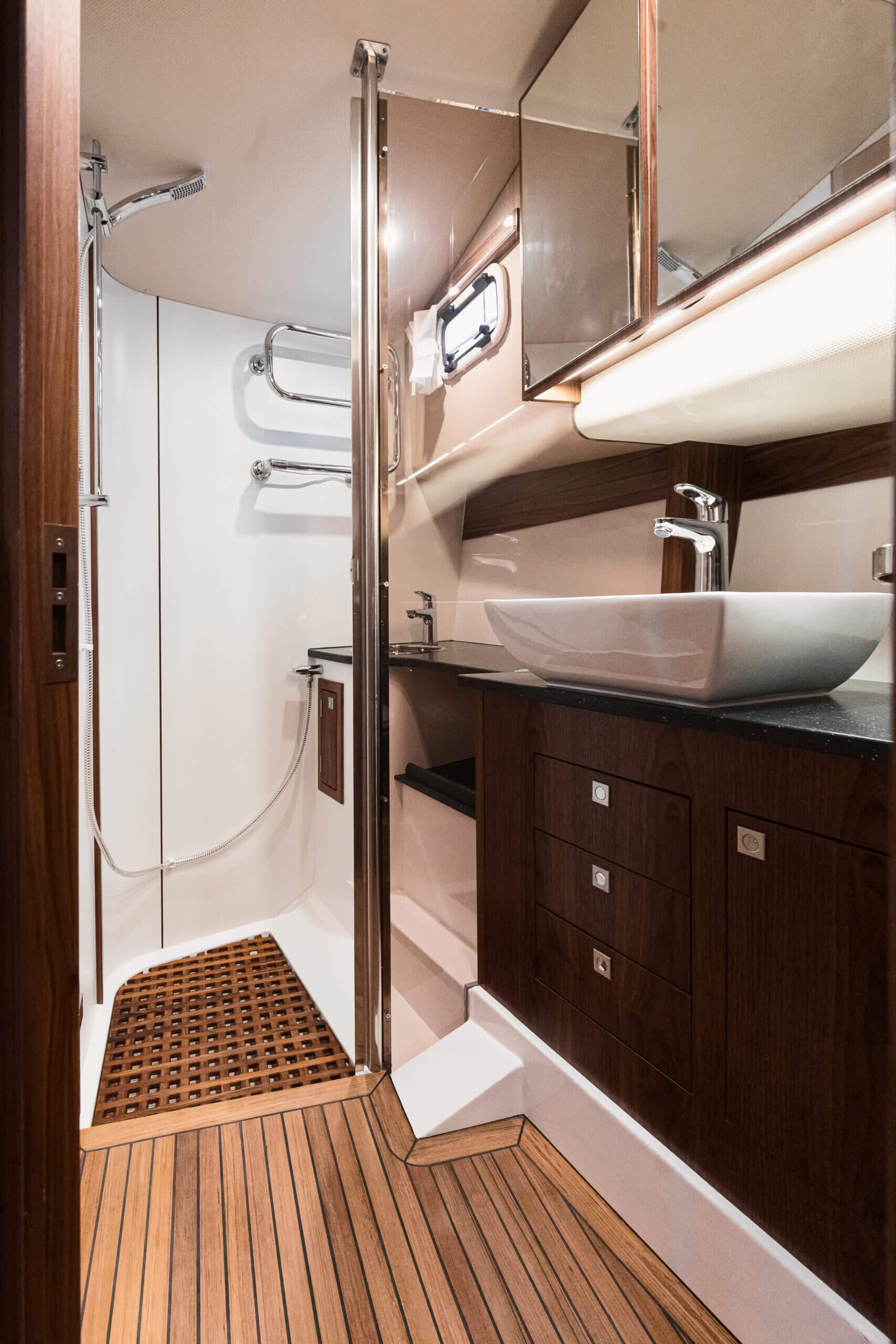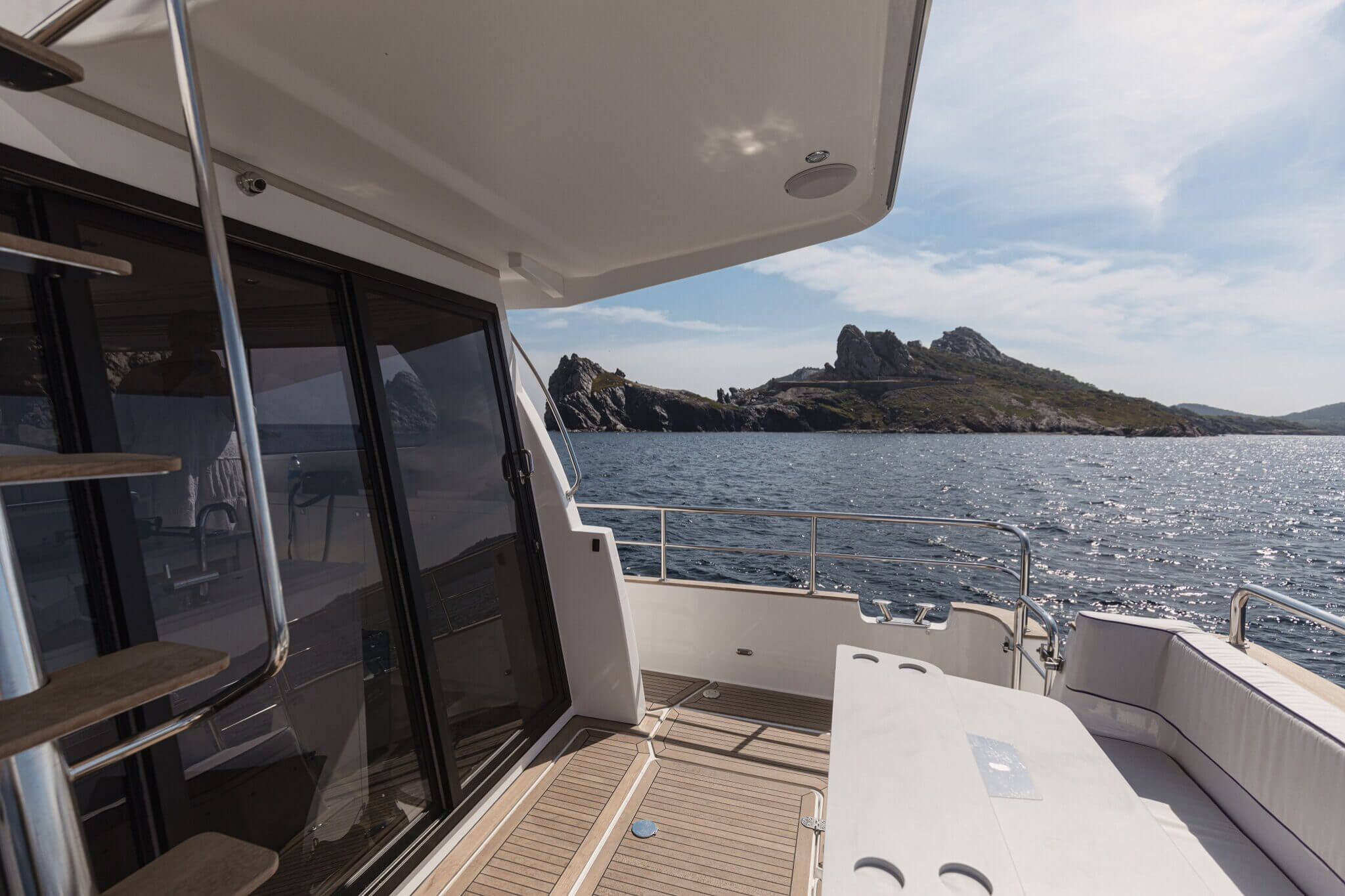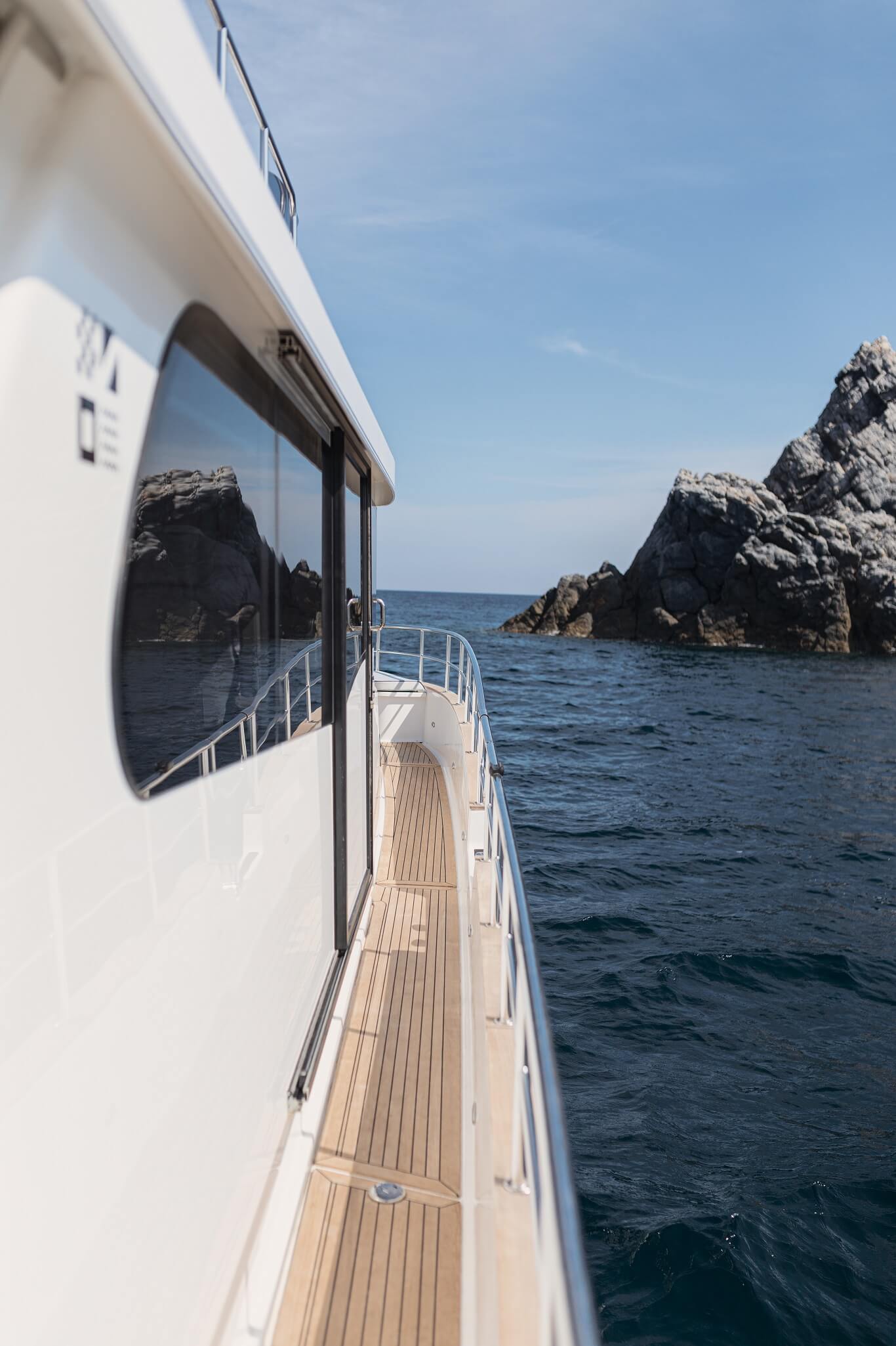 Flybridge on peaaegu 20 m² suurune ning seda saab kujundada omaniku täpse nägemuse järgi — olgu selleks lounge-ala, söögiala, täiendav juhtimispult või päikesetekk. Walkaround-tekk kogu paadi ulatuses tagab turvalise ja takistusteta liikumise pardal.