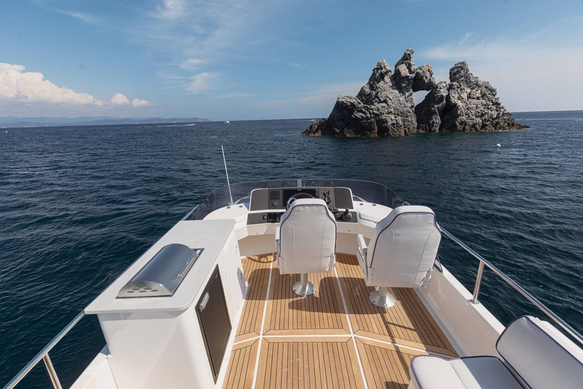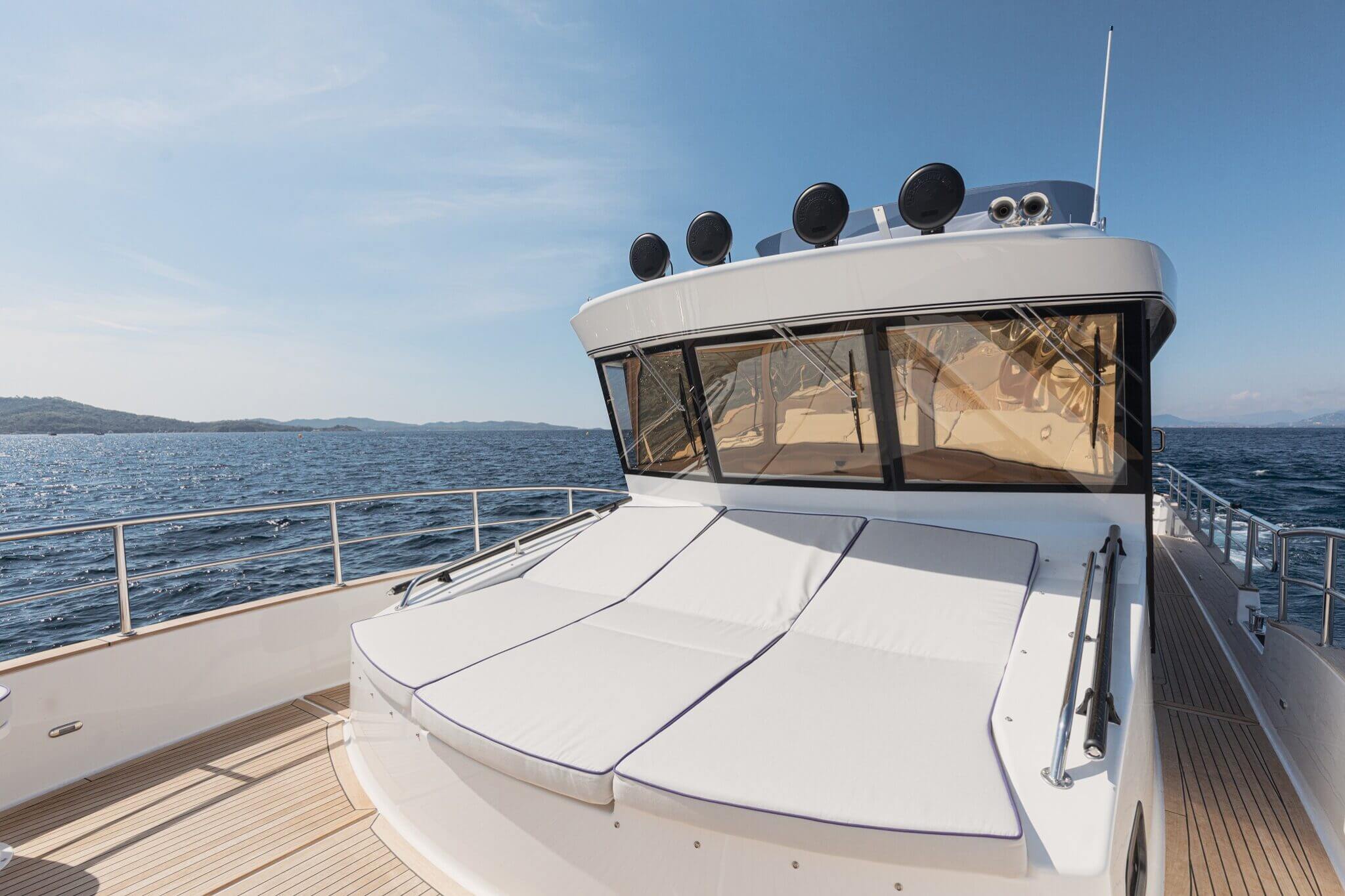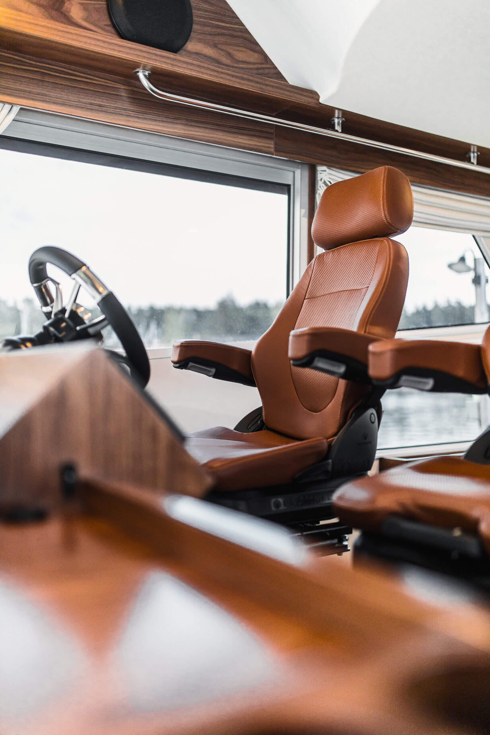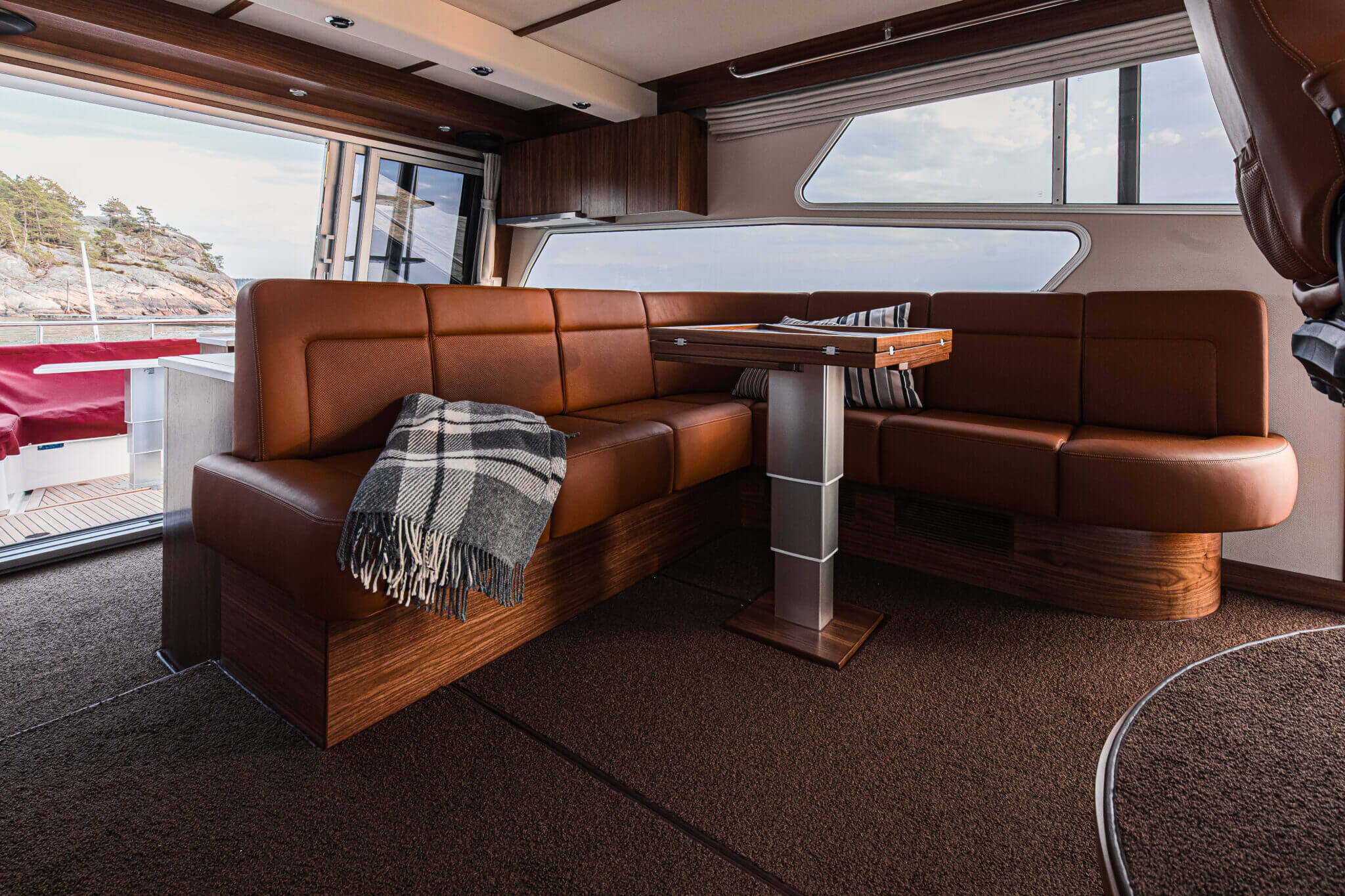 Flybridge on peaaegu 20 m² suurune ning seda saab kujundada omaniku täpse nägemuse järgi — olgu selleks lounge-ala, söögiala, täiendav juhtimispult või päikesetekk. Walkaround-tekk kogu paadi ulatuses tagab turvalise ja takistusteta liikumise pardal.