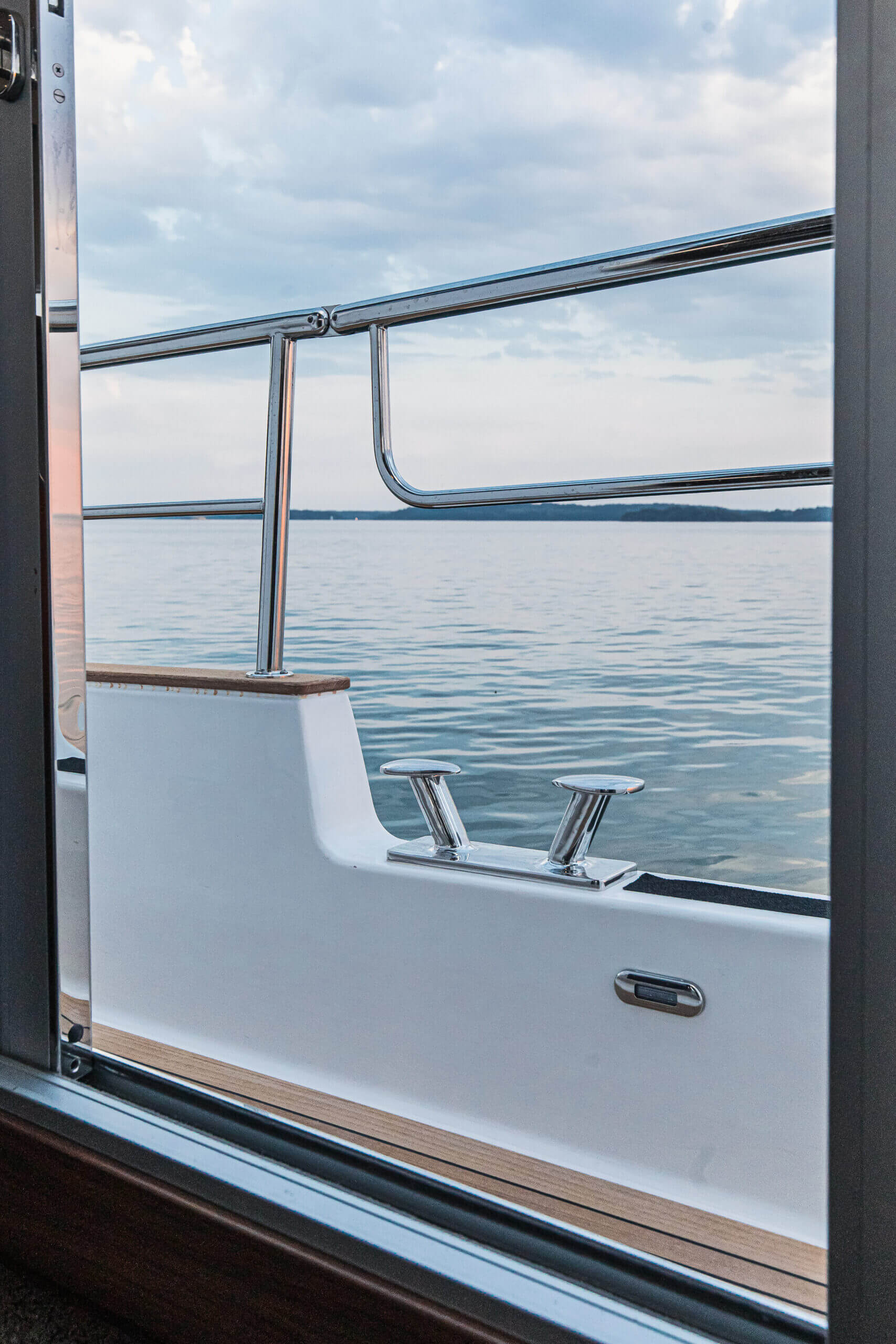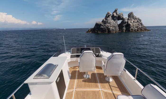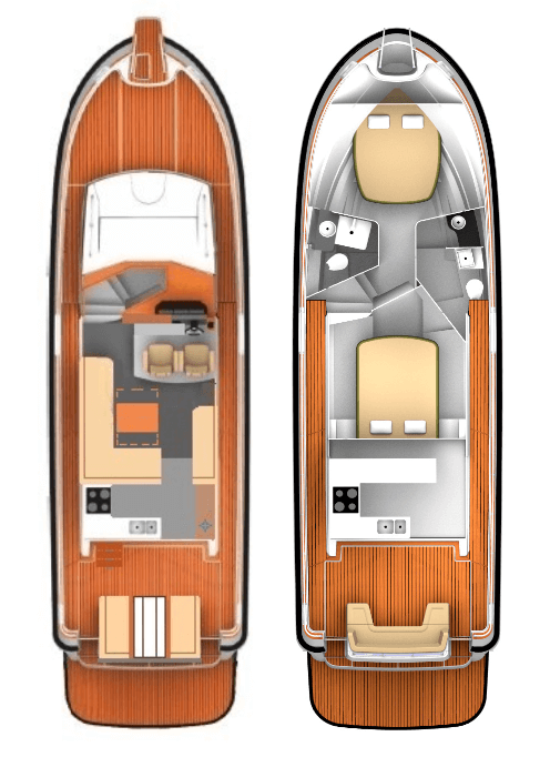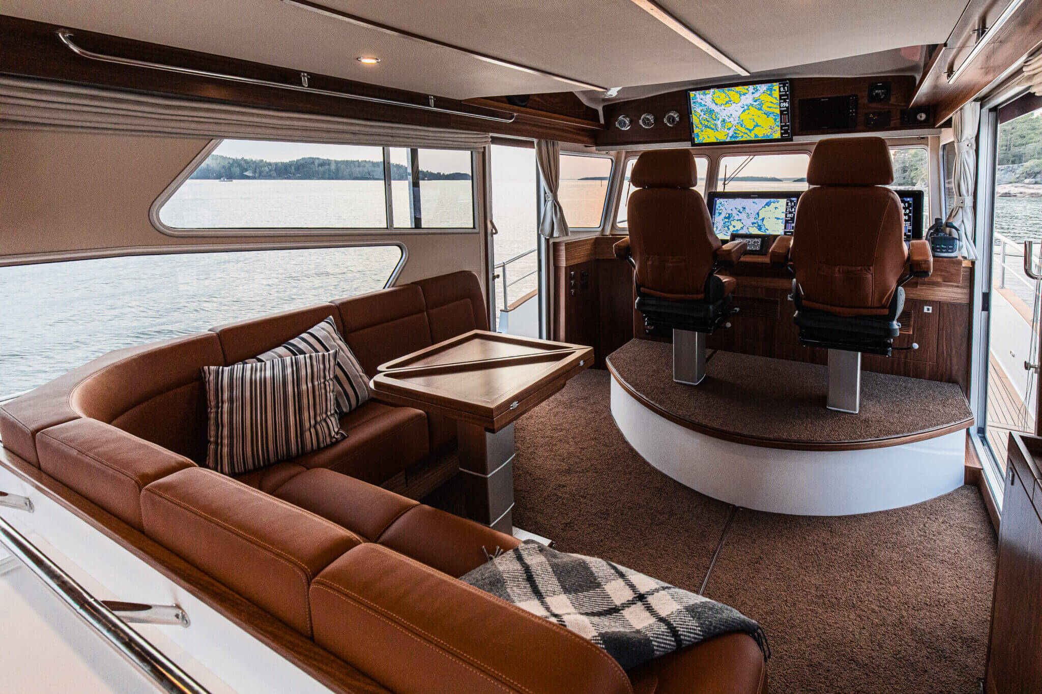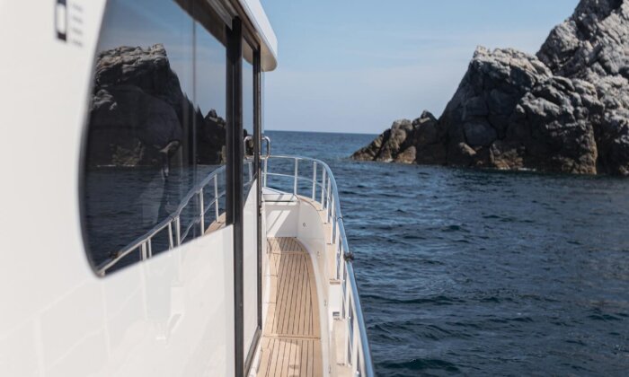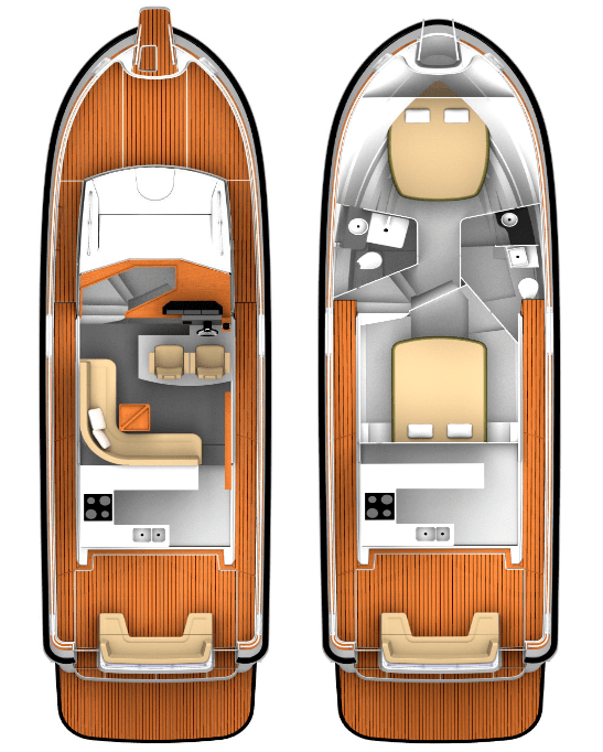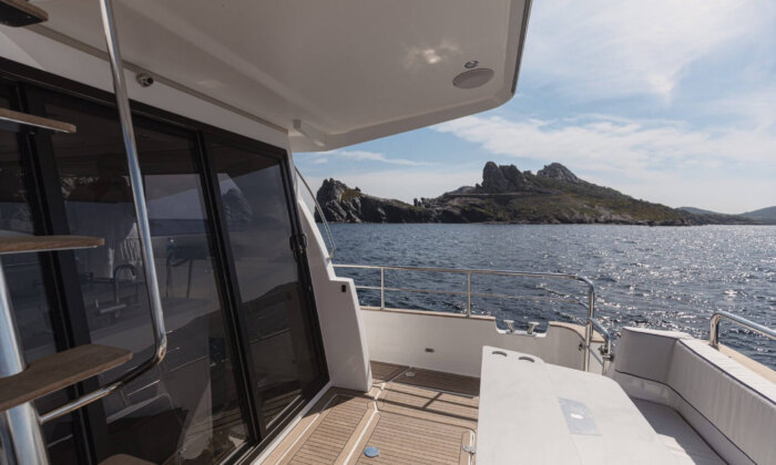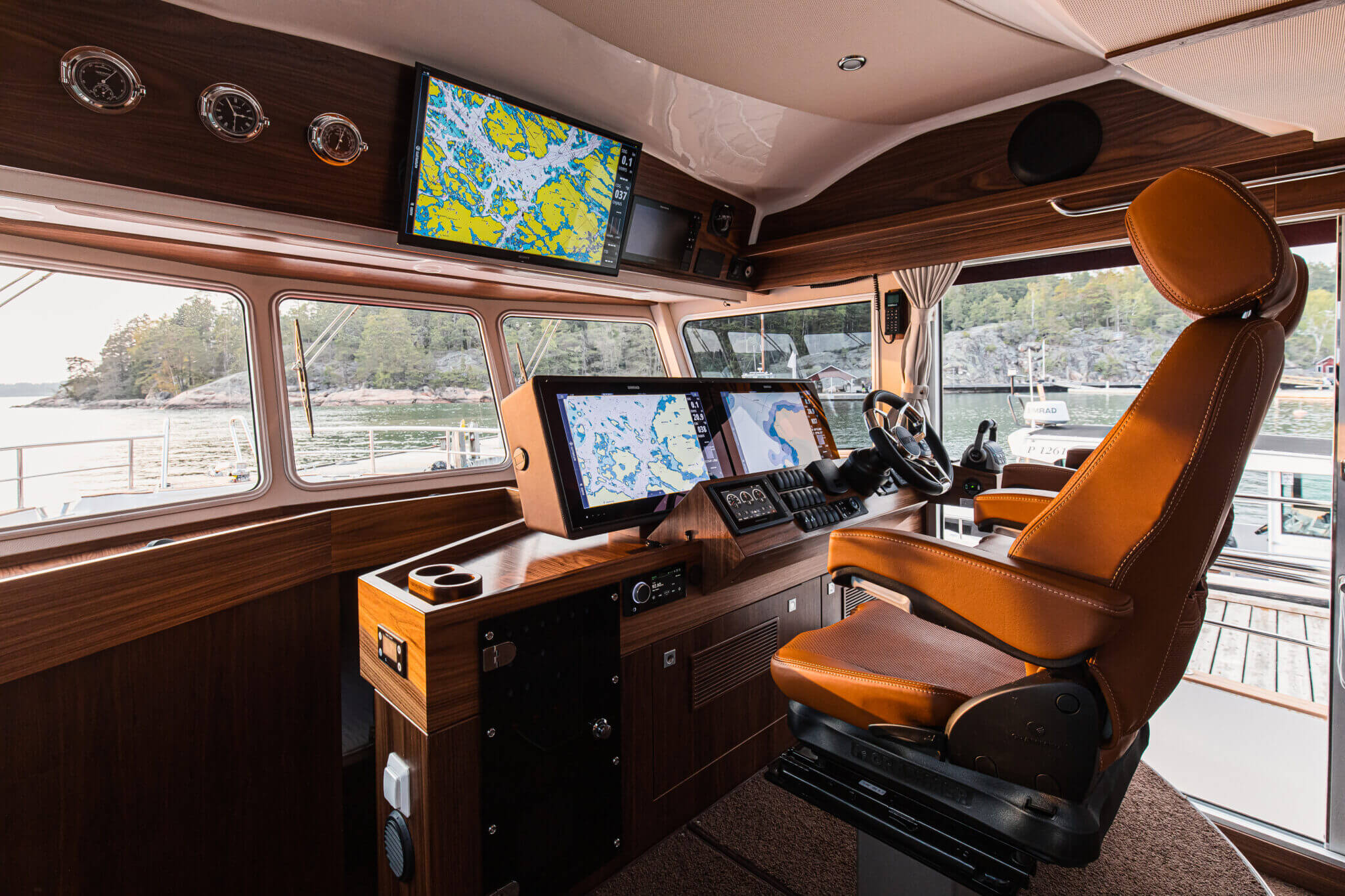 Flybridge on peaaegu 20 m² suurune ning seda saab kujundada omaniku täpse nägemuse järgi — olgu selleks lounge-ala, söögiala, täiendav juhtimispult või päikesetekk. Walkaround-tekk kogu paadi ulatuses tagab turvalise ja takistusteta liikumise pardal.