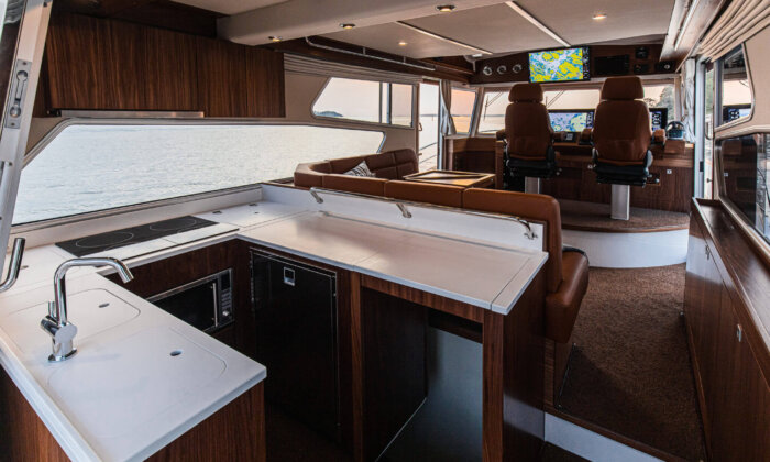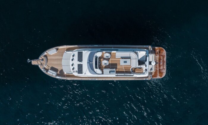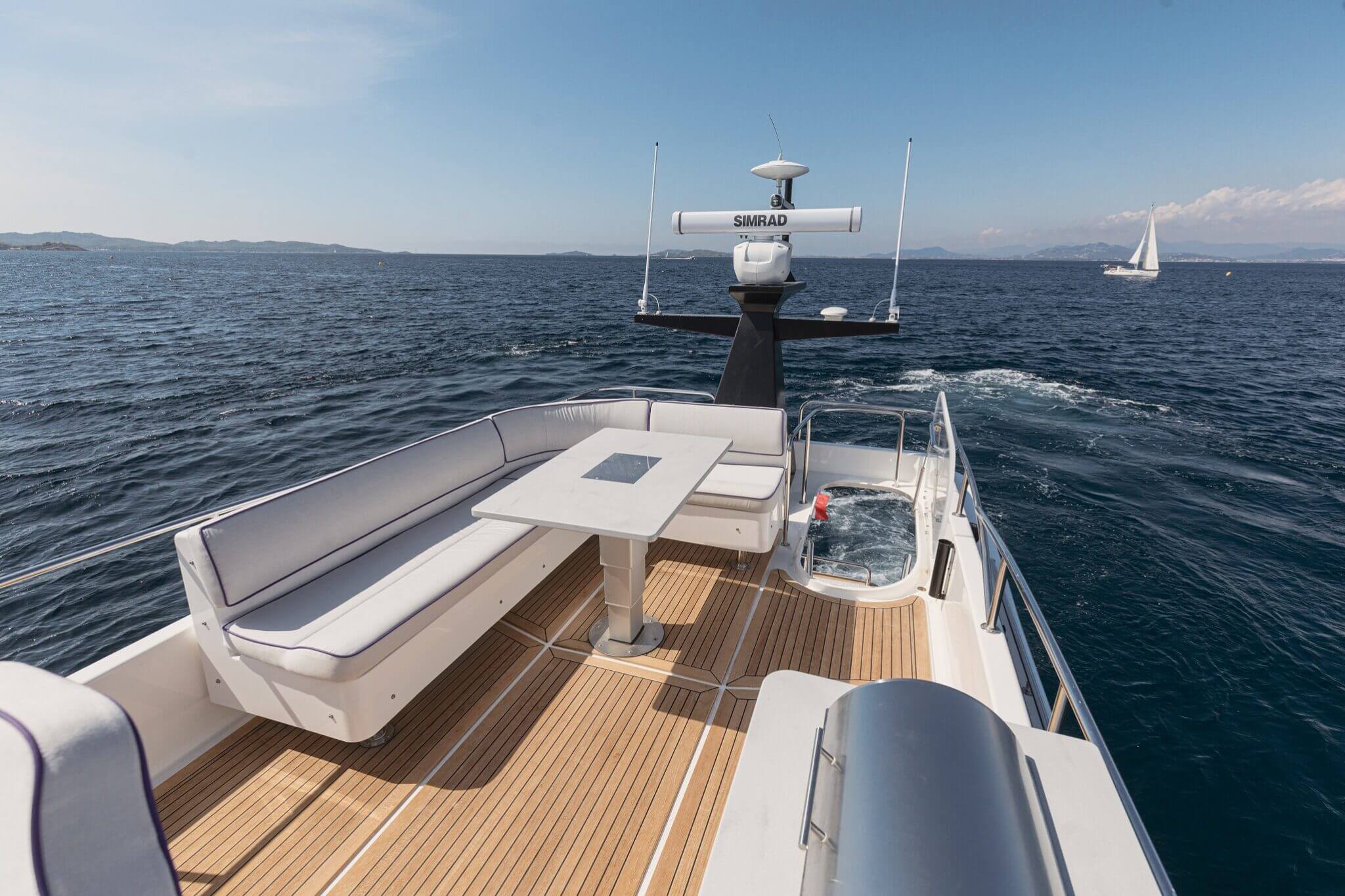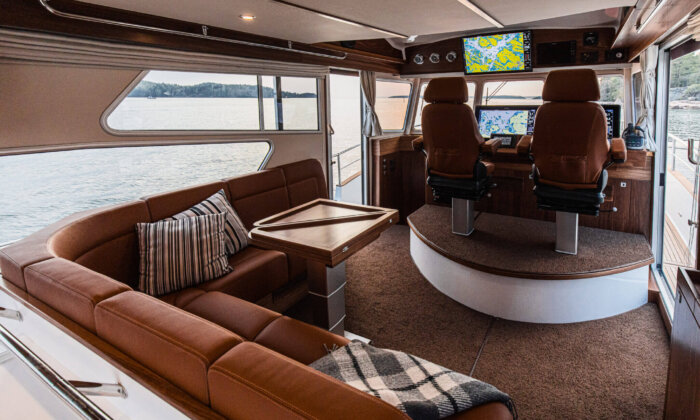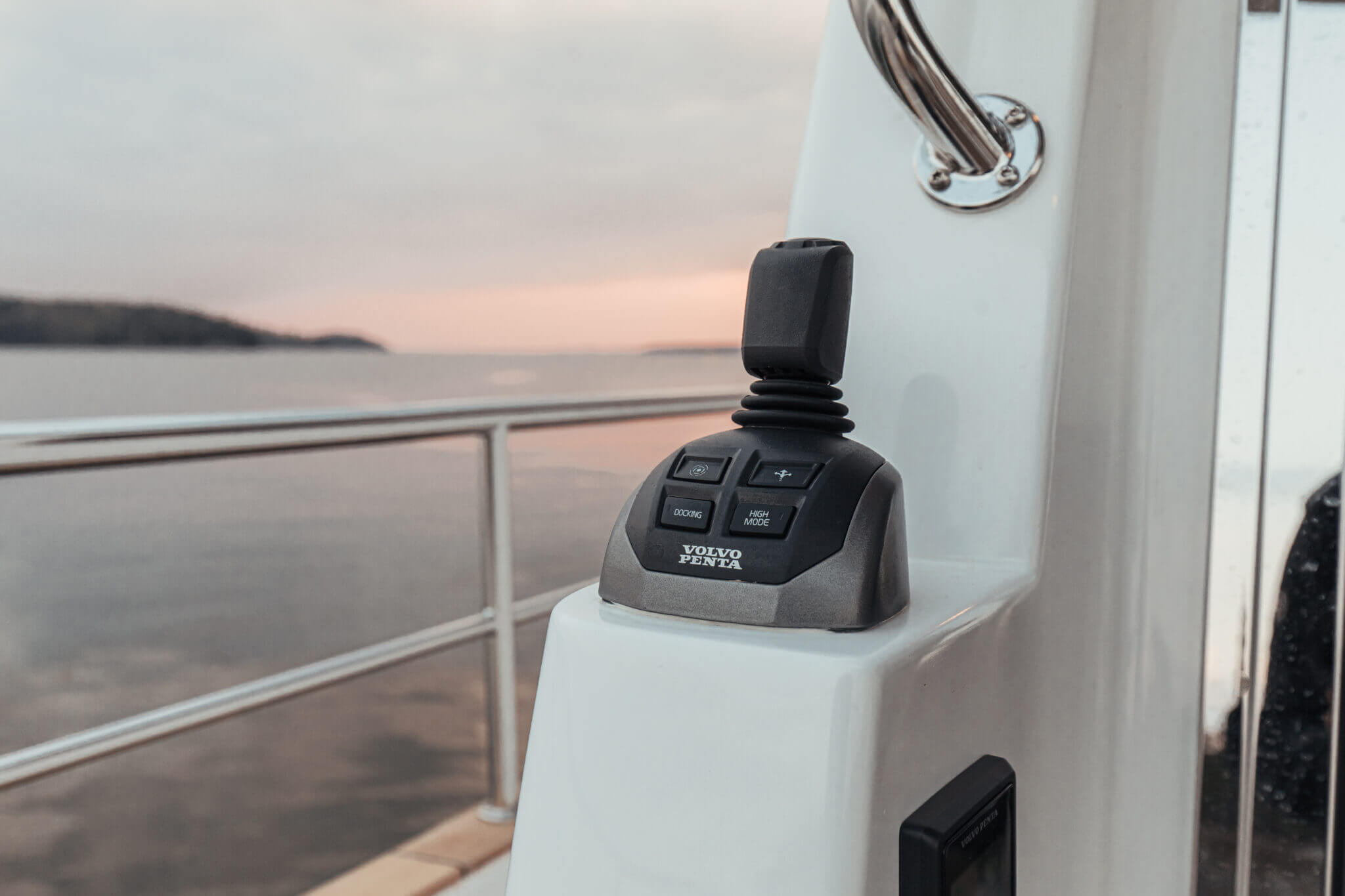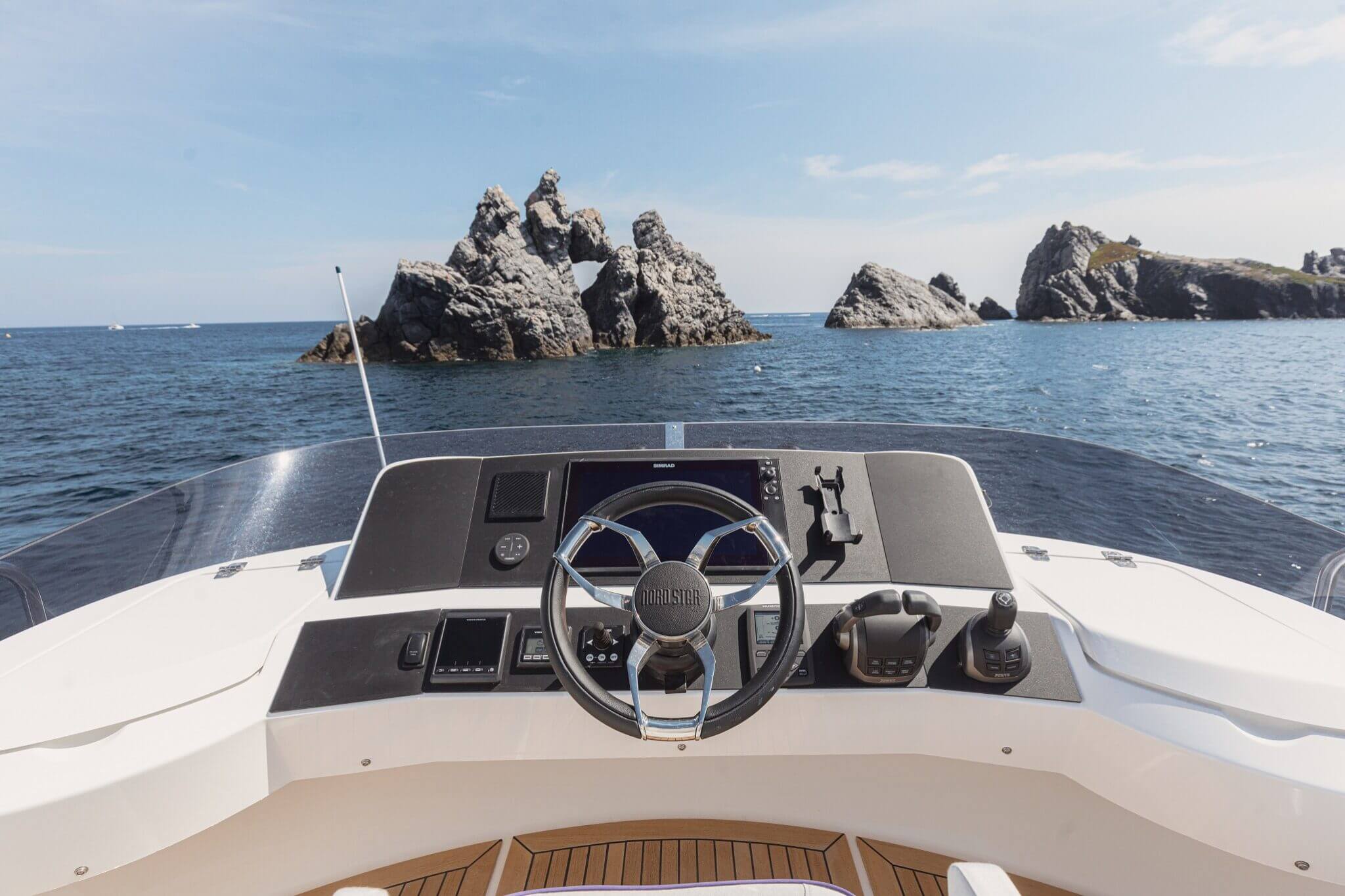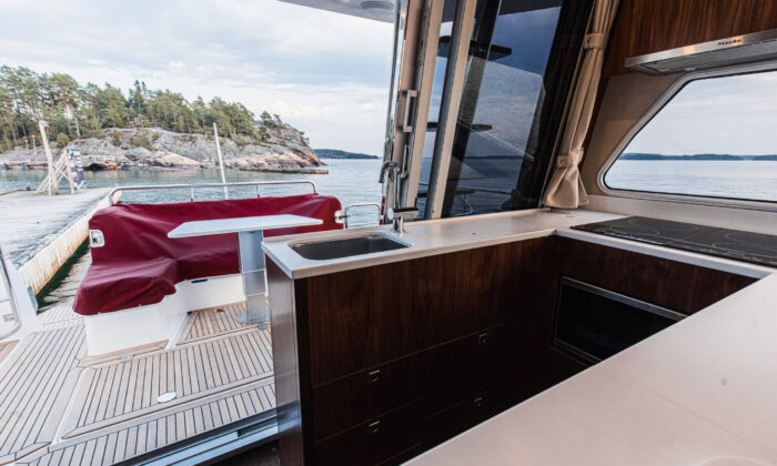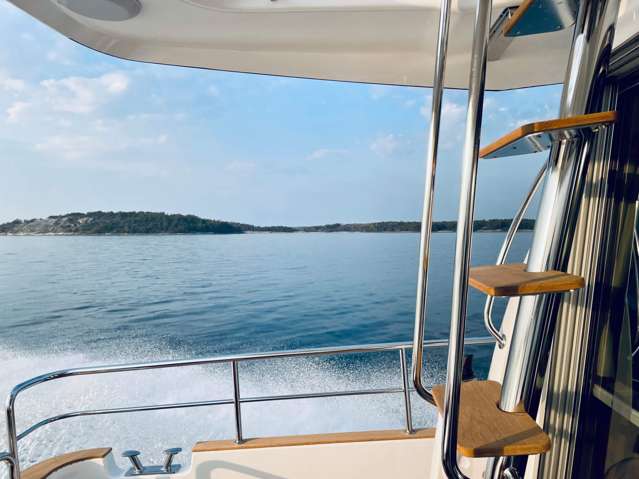 Flybridge on peaaegu 20 m² suurune ning seda saab kujundada omaniku täpse nägemuse järgi — olgu selleks lounge-ala, söögiala, täiendav juhtimispult või päikesetekk. Walkaround-tekk kogu paadi ulatuses tagab turvalise ja takistusteta liikumise pardal.