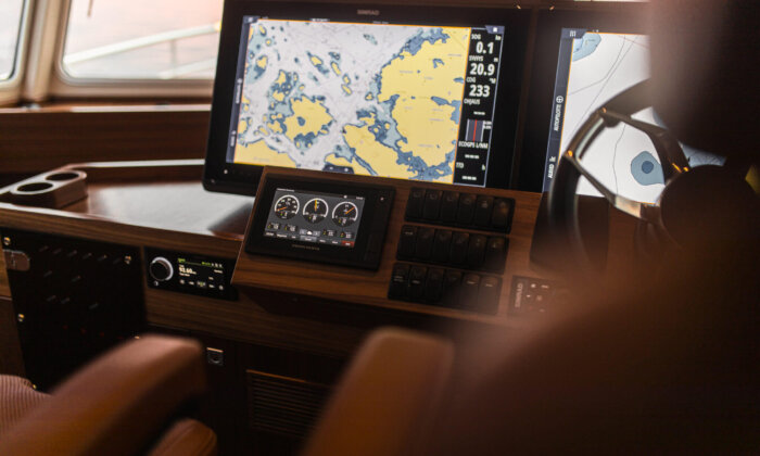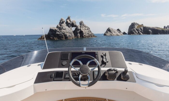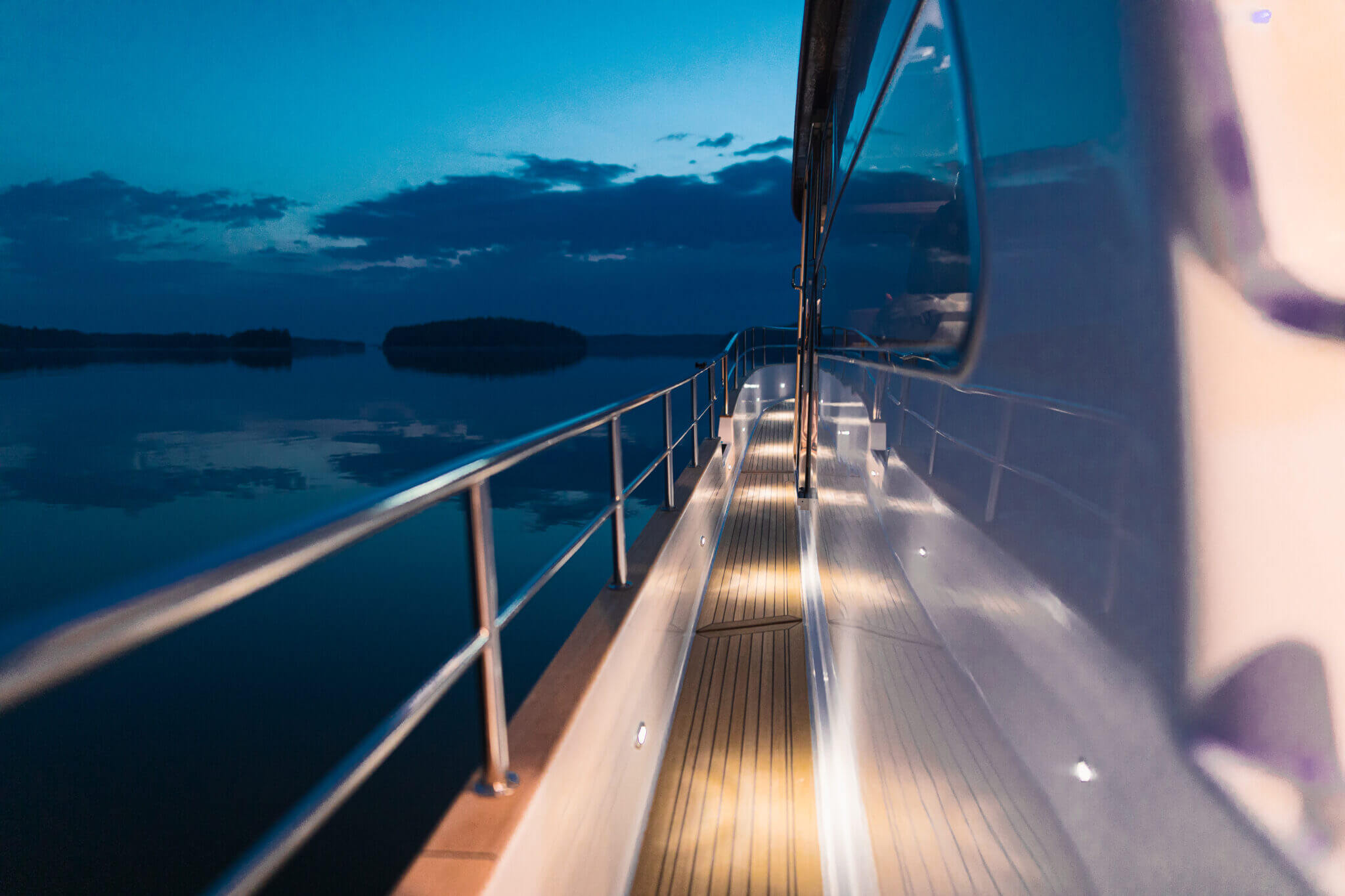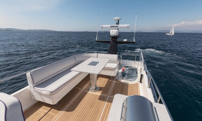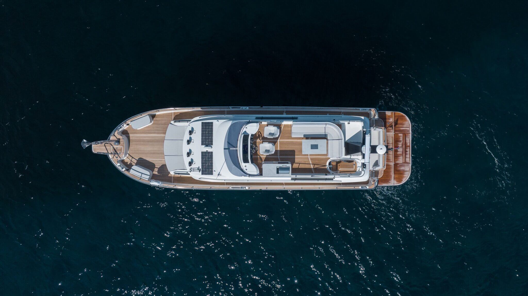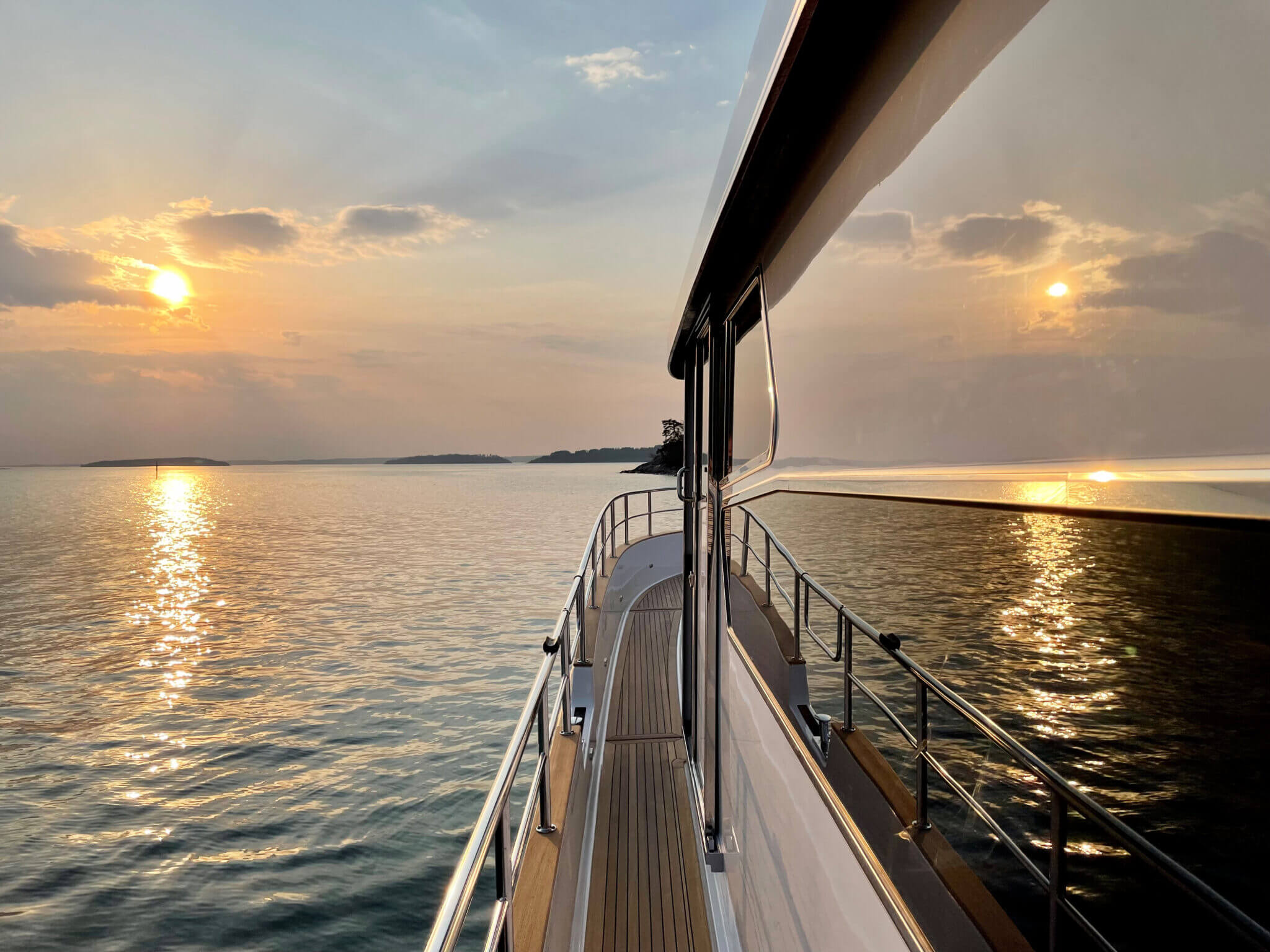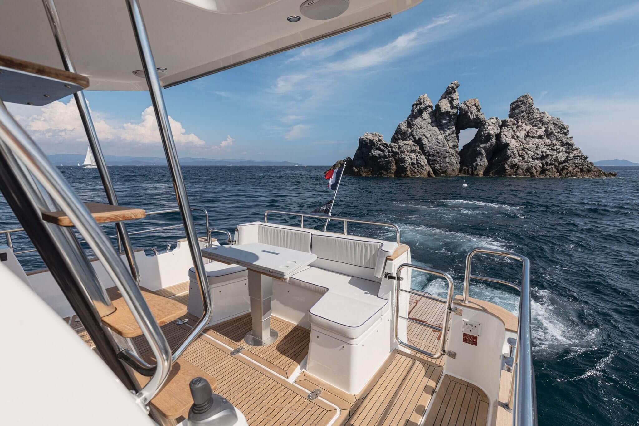 Flybridge on peaaegu 20 m² suurune ning seda saab kujundada omaniku täpse nägemuse järgi — olgu selleks lounge-ala, söögiala, täiendav juhtimispult või päikesetekk. Walkaround-tekk kogu paadi ulatuses tagab turvalise ja takistusteta liikumise pardal.