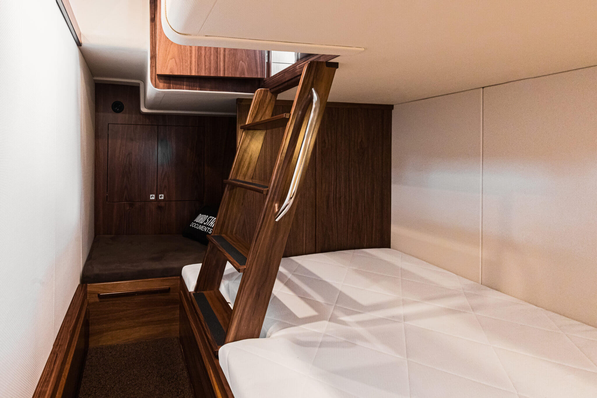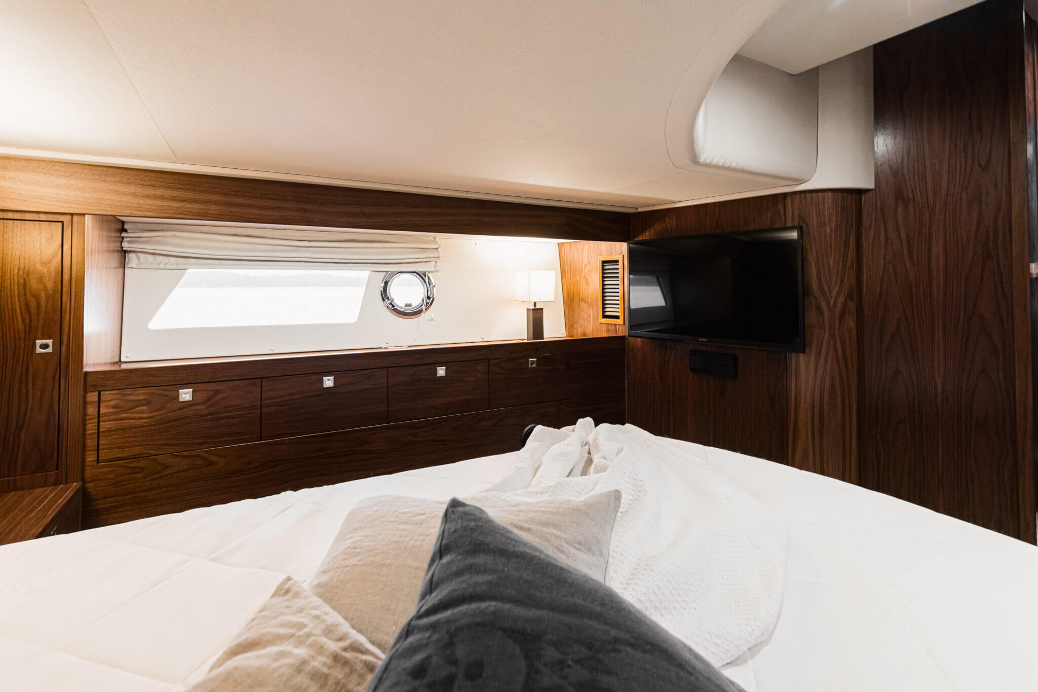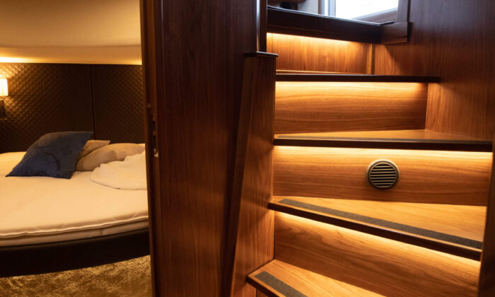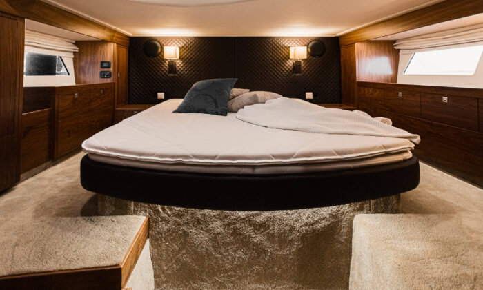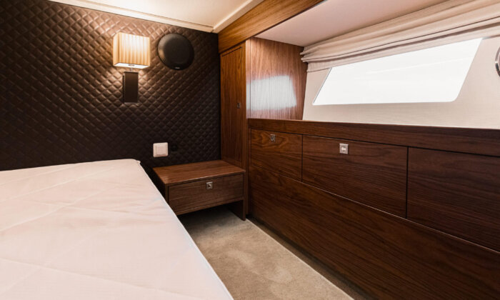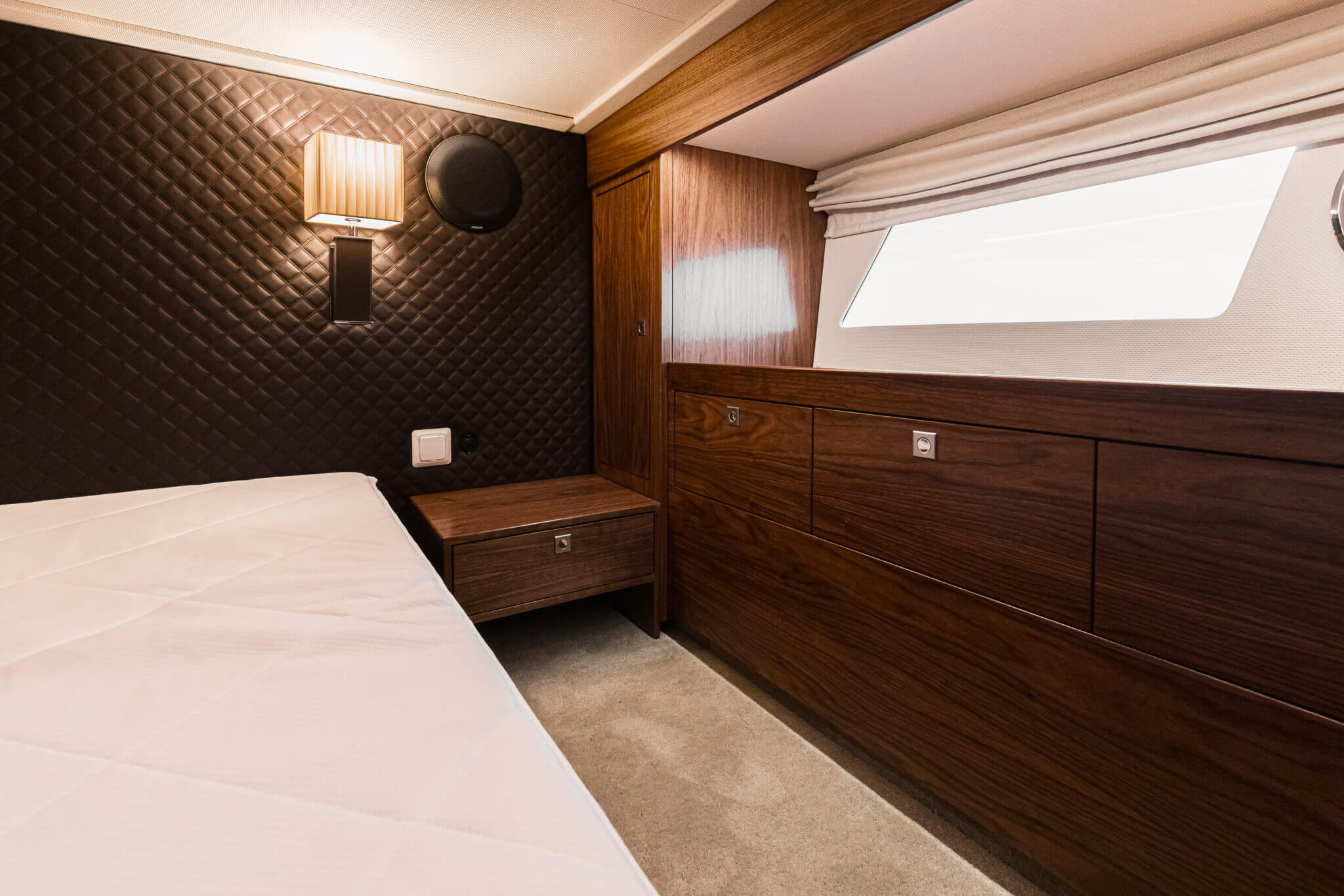 Interjöör on avar ja stiilne, kasutades luksuslikke materjale ja nutikat ruumilahendust. Kolm täislaiuses kajutit pakuvad magamiskohti kuni kuuele täiskasvanule, iga kajut on oma klassi kohta erakordselt kõrge seisuruumiga. Standardpaigutus sisaldab kolme kajutit, kaht eraldi WC-d ning eraldi duširuumi.