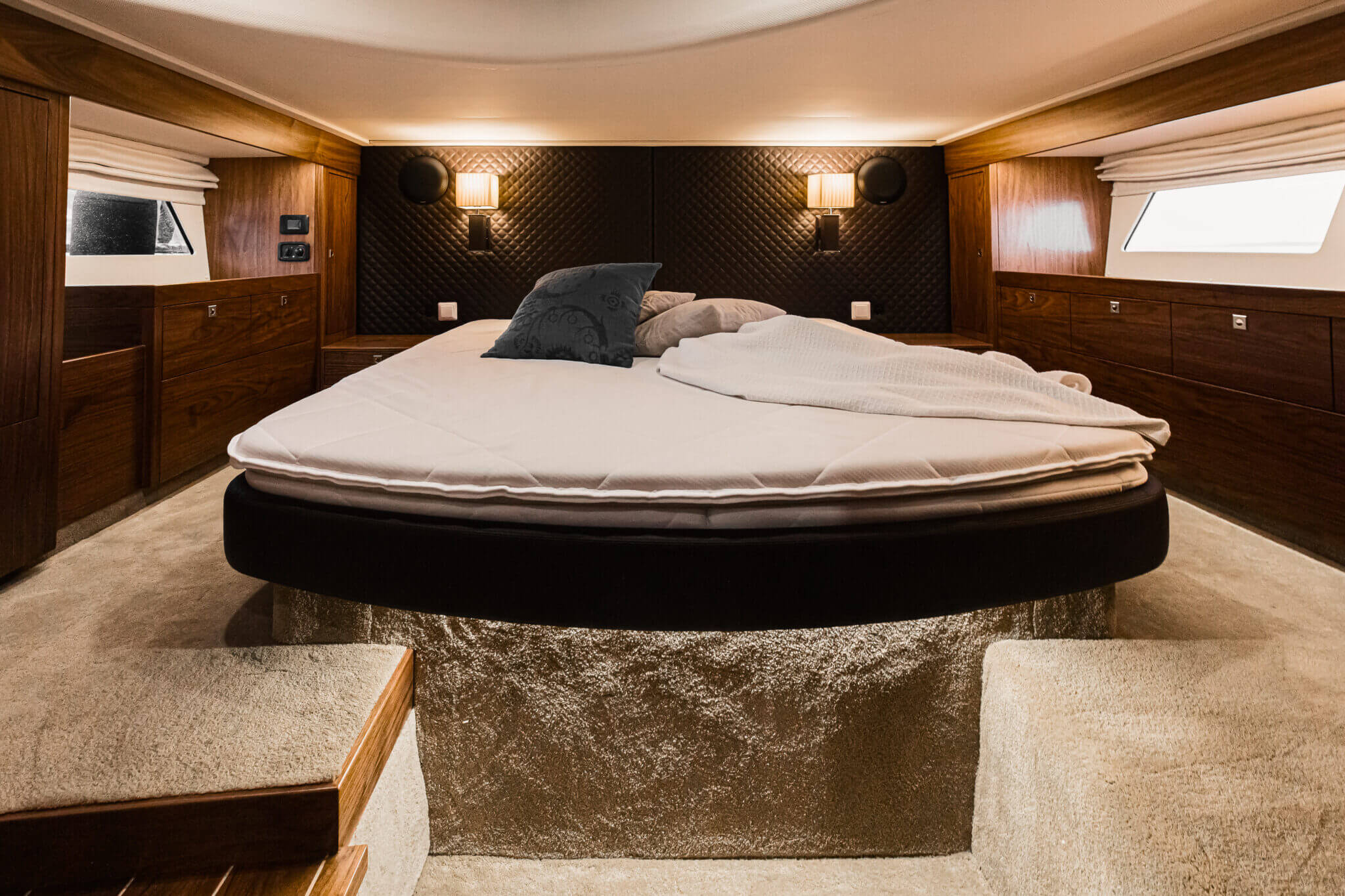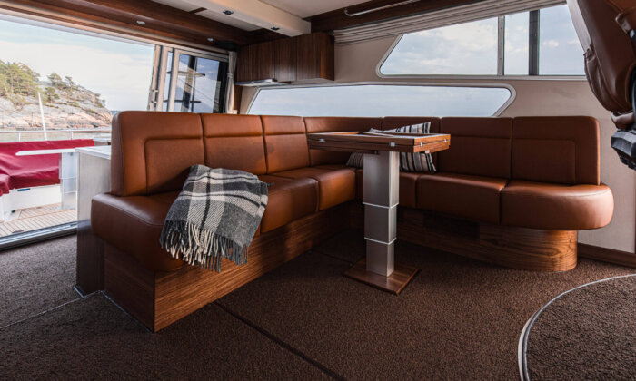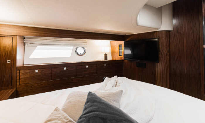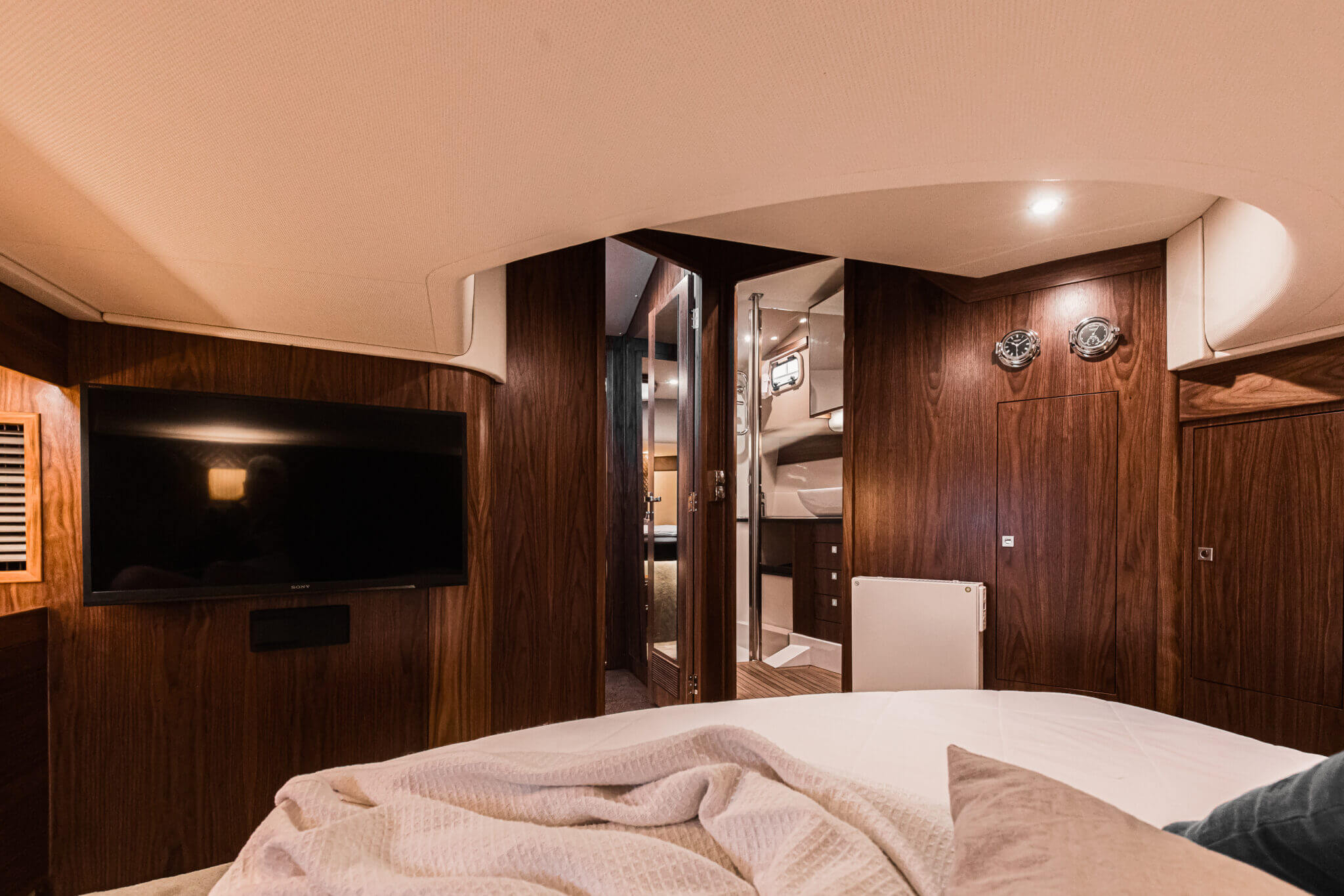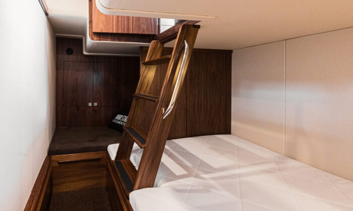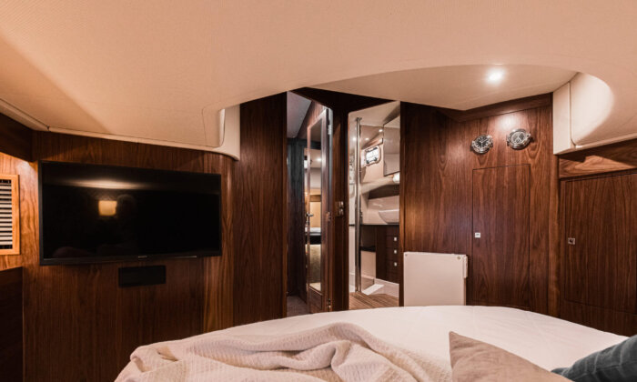 Interjöör on avar ja stiilne, kasutades luksuslikke materjale ja nutikat ruumilahendust. Kolm täislaiuses kajutit pakuvad magamiskohti kuni kuuele täiskasvanule, iga kajut on oma klassi kohta erakordselt kõrge seisuruumiga. Standardpaigutus sisaldab kolme kajutit, kaht eraldi WC-d ning eraldi duširuumi.