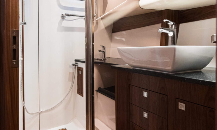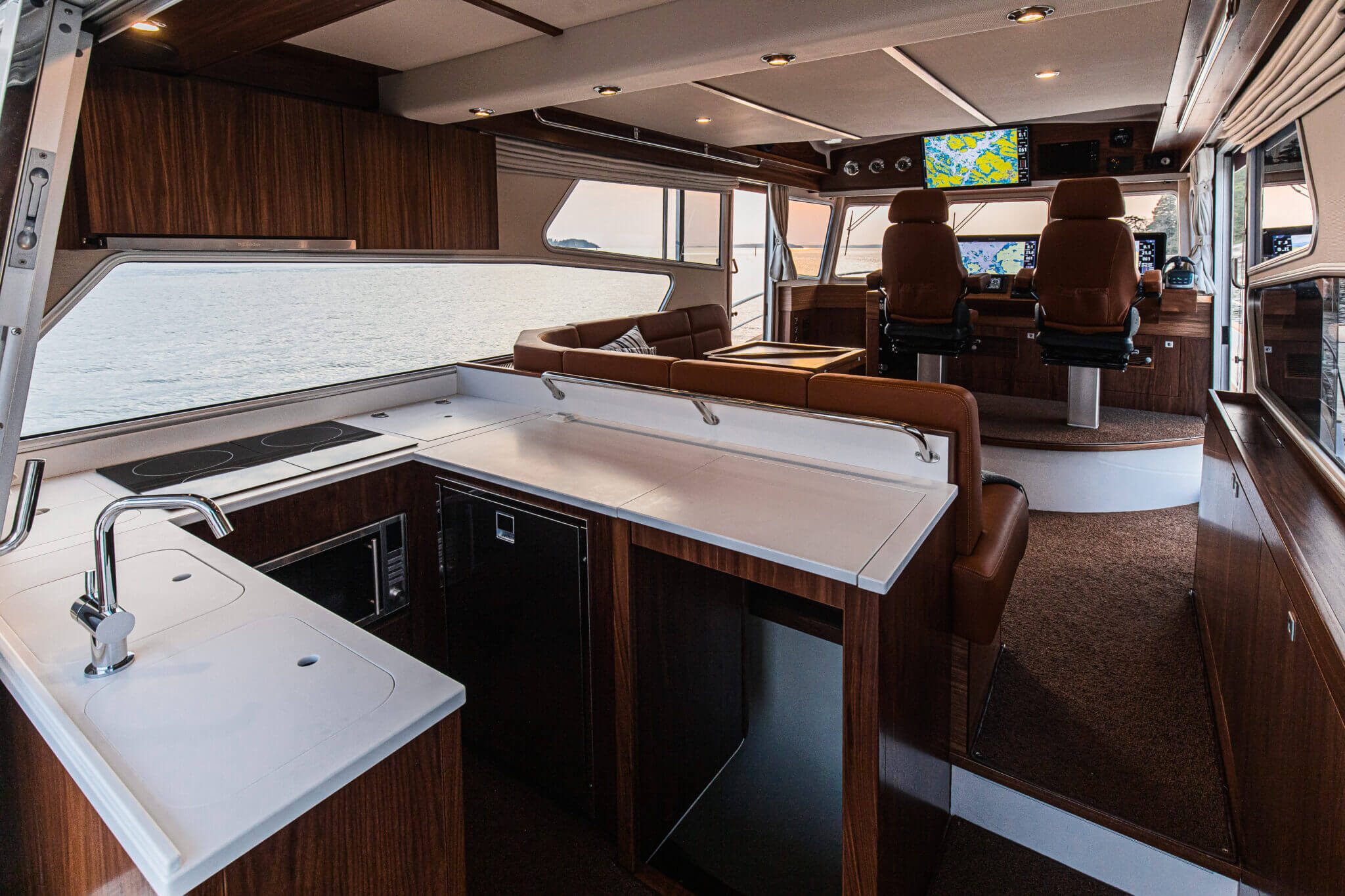 Köök on paigutatud salongi, pakkudes avarat tööpinda, nutikat panipaigalahendust ja mugavat ligipääsu nii sise- kui välisruumidele. Salongi läbimõeldud planeering loob avara ja ühendatud elukeskkonna, mis sobib suurepäraselt nii perega ajaveetmiseks kui ka külaliste vastuvõtmiseks. Paigutusvõimalused võimaldavad muuta ühe kajuti meeskonnaruumiks, lisada täiendavaid magamiskohti või kasutada seda ruumi panipaiga või pesuruumina — 49+ on tõeline semi-custom luksusjaht.