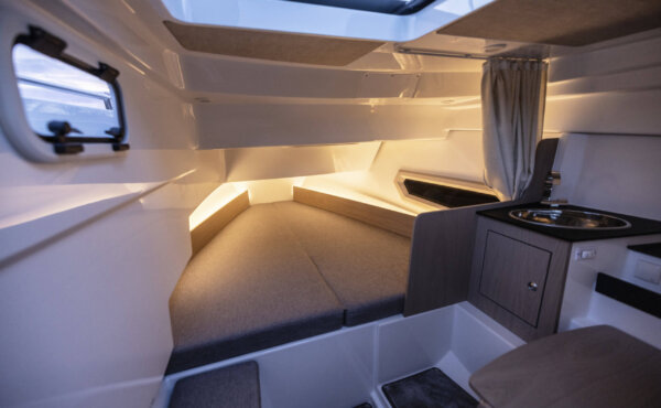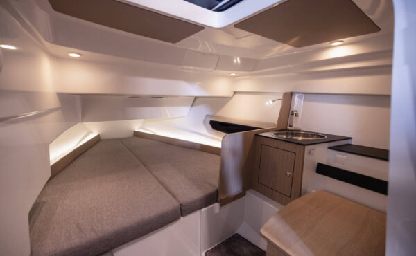 The layout comes with three rotating seats at the helm, a sofa with a sliding backrest and a wet bar unit. A suite of helpful features are standard such as twin Garmin 12″ plotters, bow thruster and automatic trim tabs to guarantee the best possible driving and docking experience.