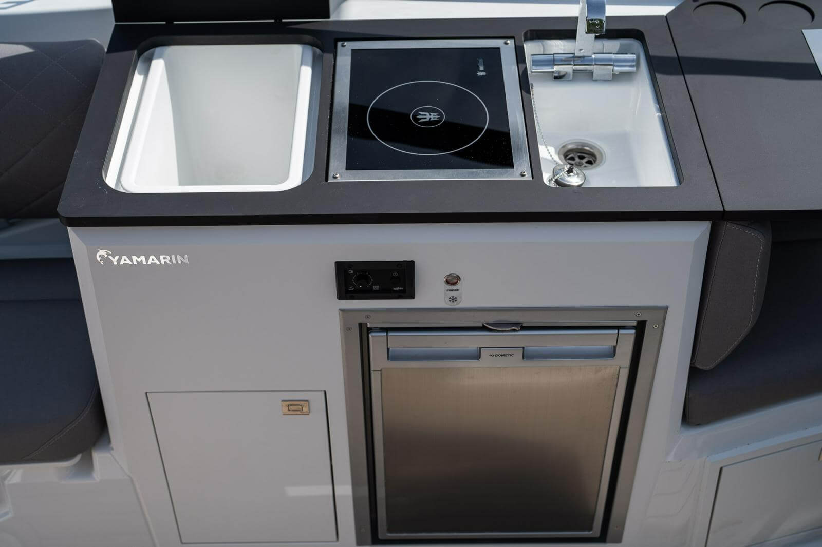 Standard equipment includes an electrical WC, refrigerator, 16″ Yamarin Q smart display, Navionics charts and Softdeck coatings in the open space. Optional equipment includes a second 16″ display, heating or air conditioning, a bimini top or canopy, a table in the open space, a sunbed and a bimini top for the bow deck.