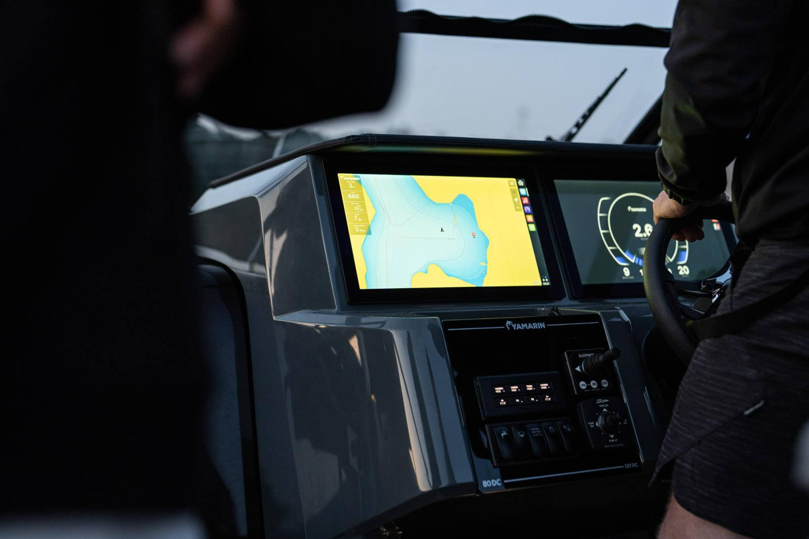 Yamarin 80 DC features a clearly laid-out cockpit, which has been designed with designated places for screens, Yamaha gauges and the joystick that controls the engine, as well as a charging port for phones.